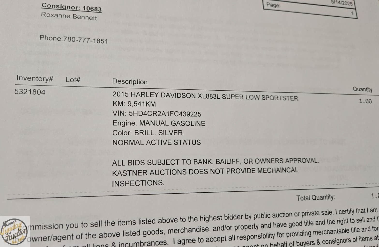 ALL BIDS SUBJECT TO BANK, BAILIFF, OR OWNERS APPROVAL. KASTNER AUCTIONS DOES NOT PROVIDE MECHAINCAL INSPECTIONS. **ALL ITEMS MUST BE REMOVED BY 5PM SATURDAY, MAY 24TH 2025. ALL REMAINING ITEMS WILL BE SUBJECT TO A $6.00 PER DAY STORAGE CHARGE. ANY ITEMS REMAINING AFTER MONDAY, JUNE 9TH 2025 WILL BE CONSIDERED FORFEITED. NO REFUNDS WILL BE ISSUED FOR FORFEITED ITEMS. TO SCHEDULE A PICK UP APPOINTMENT CLICK HERE