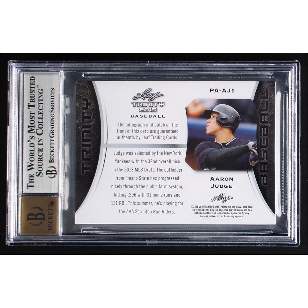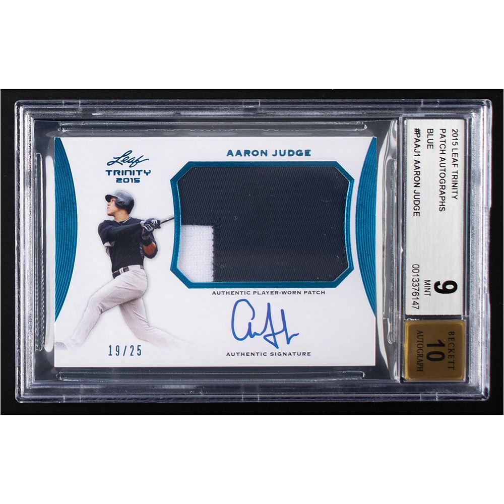 Graded by BGS MINT 9, with an autograph grade of 10. Desirable autographed player-worn jersey card of New York Yankees right fielder Aaron Judge, numbered 19/25, featuring a great rookie-era signature and a large patch swatch.