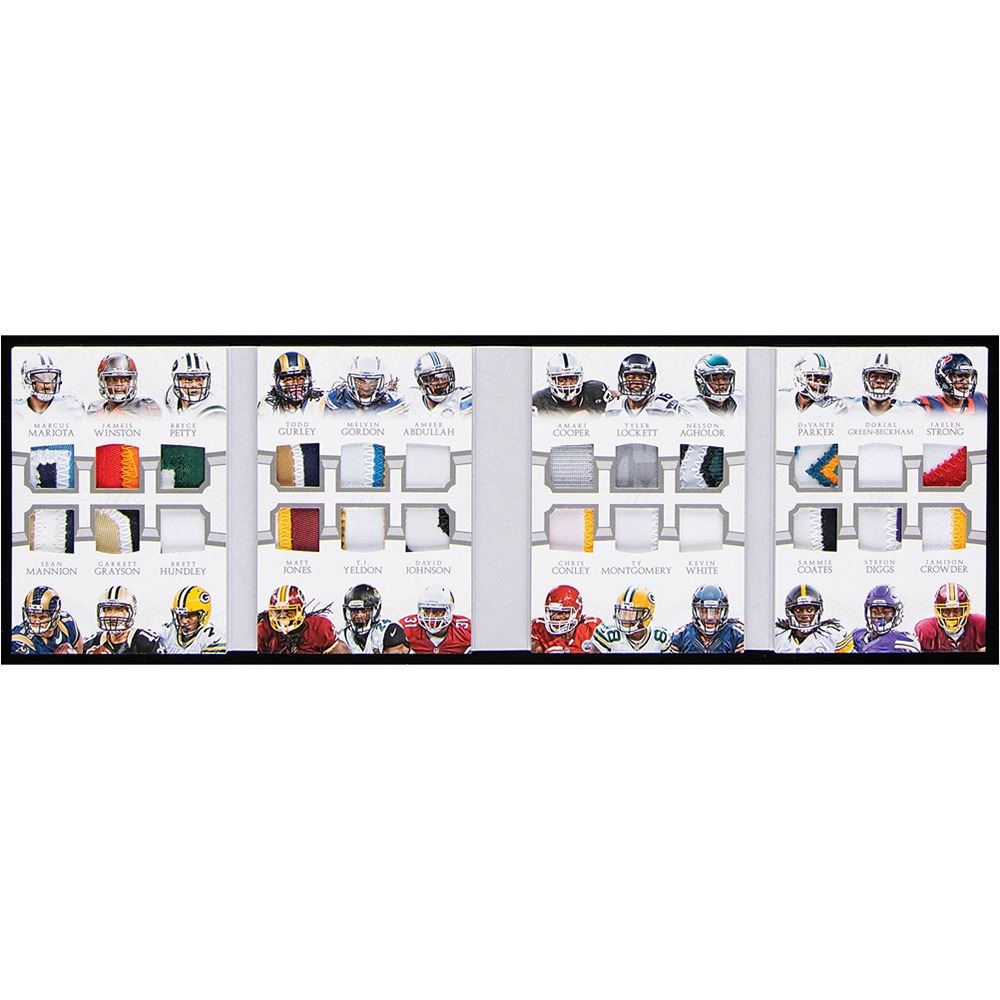 Incredible fold-out four-panel 'Treasure Chest' of player-worn materials, numbered 8/25, with swatches (mostly colorful patch segments) from 24 NFL stars: Marcus Mariota, Jameis Winston, Bryce Petty, Sean Mannion, Garrett Grayson, Brett Hundley, Todd Gurley, Melvin Gordon, Ameer Abdullah, Matt Jones, T. J. Yeldon, David Johnson, Amari Cooper, Tyler Lockett, Nelson Agholor, Chris Conley, Ty Montgomery, Kevin White, DeVante Parker, Dorial Green-Beckham, Jaelen Strong, Sammie Coates, Stefon Diggs, and Jamison Crowder.