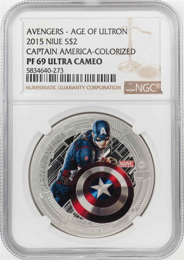 One 2015 Niue $2 Proof Avengers Age of Ultron Captain America Silver Coin NGC PF69 Ultra Cameo. NGC Certified.