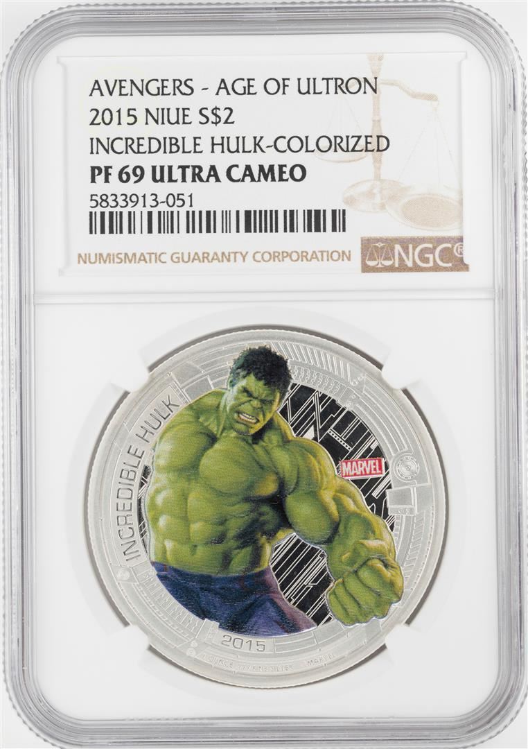 One 2015 Niue $2 Proof Avengers Age of Ultron Incredible Hulk Silver Coin NGC PF69 Ultra Cameo. NGC Certified.