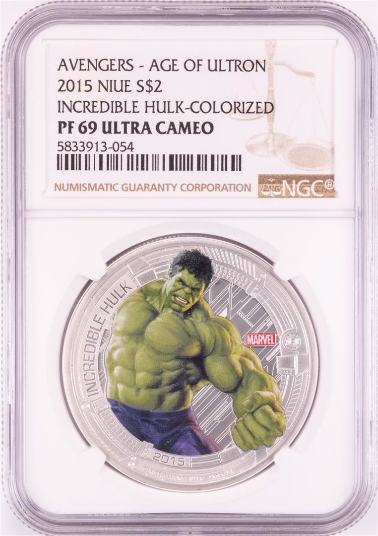 One 2015 Niue $2 Proof Avengers Age of Ultron Incredible Hulk Silver Coin NGC PF69 Ultra Cameo. NGC Certified.