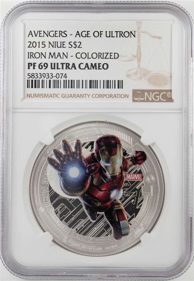One 2015 Niue $2 Proof Avengers Age of Ultron Iron Man Silver Coin NGC PF69 Ultra Cameo. NGC Certified.