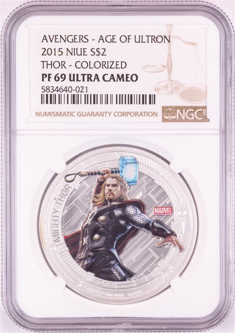 One 2015 Niue $2 Proof Avengers Age of Ultron Thor Silver Coin NGC PF69 Ultra Cameo. NGC Certified.