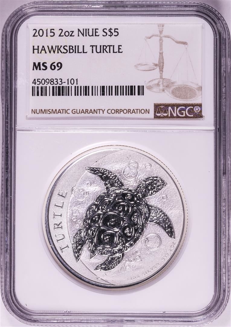 One 2015 Niue $5 Hawksbill Turtle 2oz Silver Coin NGC MS69. NGC Certified.