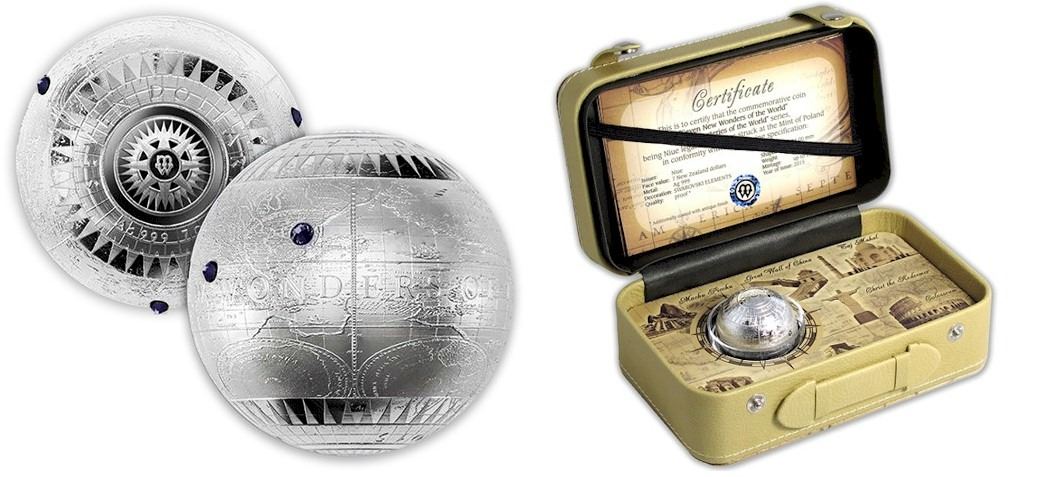 2015 Niue 7 oz Silver Seven New Wonders of the World Spherical Pure Silver Coin. Tax Exempt.
