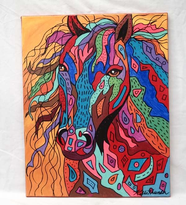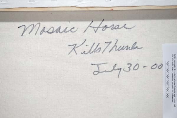 July 30, 2015 Original Acrylic Painting ''Mosaic Horse'' by Kills Thunder, measures 20'' x 16'', signed by artist, Artist Bio: Kathleen Kills Thunder (her legal name) was born in 1947 in Seattle, WA. Her father, Ben Kills Thunder, was a Sioux Indian from the Fort Peck Indian Reservation in NE Montana. Her mother was Spanish/Irish. Kathy grew up shuttling back and forth between Seattle and the Colville Indian Reservation in NE Washington. Kathy has been painting and beading since she was six. She uses a bright color palette and prodigious imagination in creating her painted and beaded work. Kathy currently lives in SE Arizona and raises buffalo when she is not pursuing her artistic endeavors.