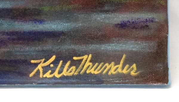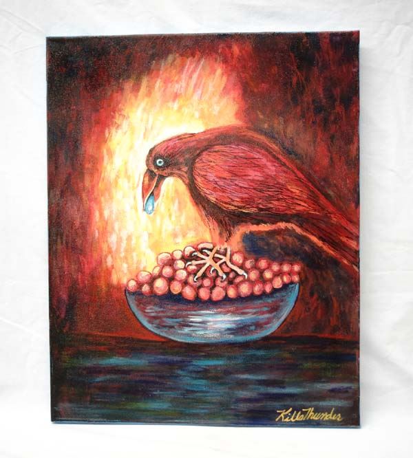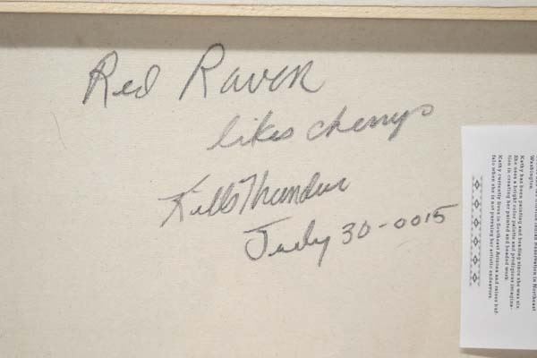 July 30, 2015 Original Acrylic Painting ''Red Raven'' by Kills Thunder, measures 20'' x 16'', signed by artist, Artist Bio: Kathleen Kills Thunder (her legal name) was born in 1947 in Seattle, WA. Her father, Ben Kills Thunder, was a Sioux Indian from the Fort Peck Indian Reservation in NE Montana. Her mother was Spanish/Irish. Kathy grew up shuttling back and forth between Seattle and the Colville Indian Reservation in NE Washington. Kathy has been painting and beading since she was six. She uses a bright color palette and prodigious imagination in creating her painted and beaded work. Kathy currently lives in SE Arizona and raises buffalo when she is not pursuing her artistic endeavors.