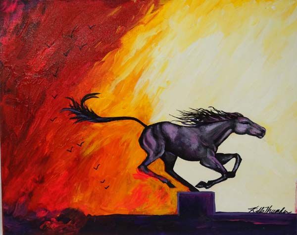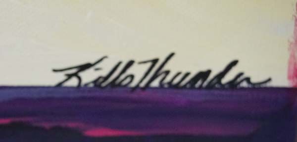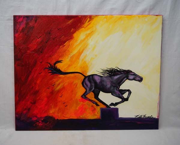 January 10, 2015 Original Acrylic Wild Fire by Kills Thunder, measures 16'' x 20'', signed in lower left corner as well as signed-dated-and titled by artist on back canvas, Artist Bio: Kathleen Kills Thunder was born in Seattle, Washington. Kathy has been painting and beading since she was six. She uses bright color palette and prodigious imagination in creating her painted and beaded work. Kathy currently lives in Southeast Arizona and raises buffalo when she is not pursuing her artistic endeavors.