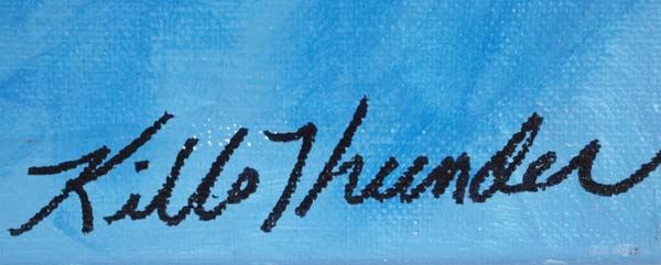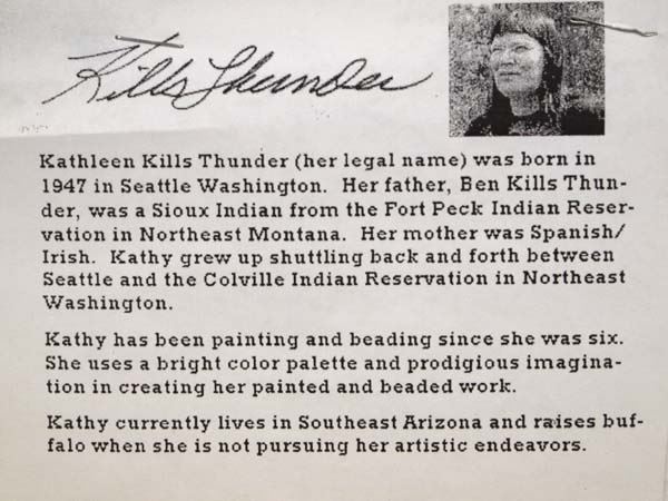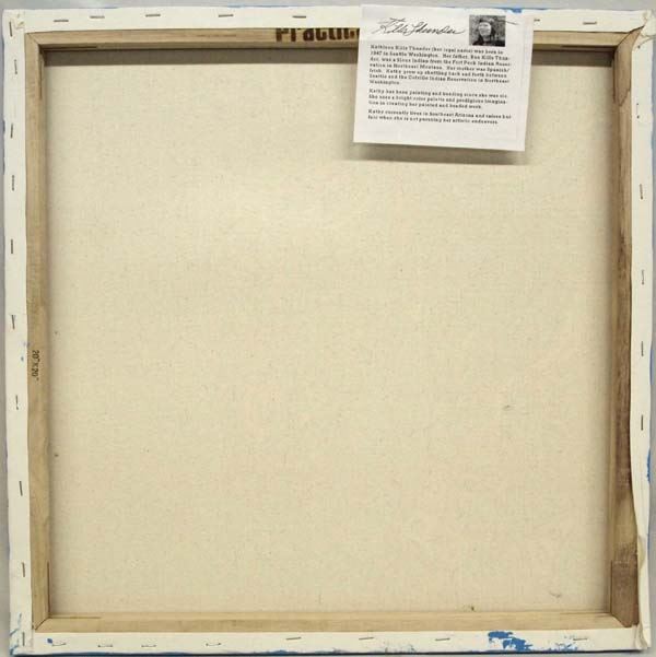 2015 Original Acrylic ''Mosaic Mustang'' by Kathy Kills Thunder, measures 20'' x 20'', signed in lower left corner by artist, Artist Bio: Kathleen Kills Thunder (her legal name) was born in 1947 in Seattle, WA. Her father, Ben Kills Thunder, was a Sioux Indian from the Fort Peck Indian Reservation in NE Montana. Her mother was Spanish/Irish. Kathy grew up shuttling back and forth between Seattle and the Colville Indian Reservation in NE Washington. Kathy has been painting and beading since she was six. She uses a bright color palette and prodigious imagination in creating her painted and beaded work. Kathy currently lives in SE Arizona and raises buffalo when she is not pursuing her artistic endeavors.