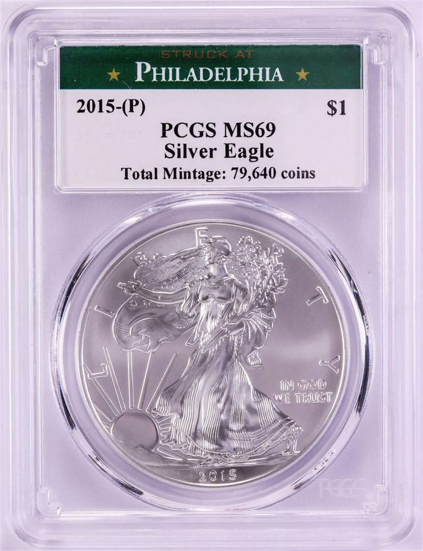One 2015-(P) $1 American Silver Eagle Coin PCGS MS69 Struck at Philadelphia.