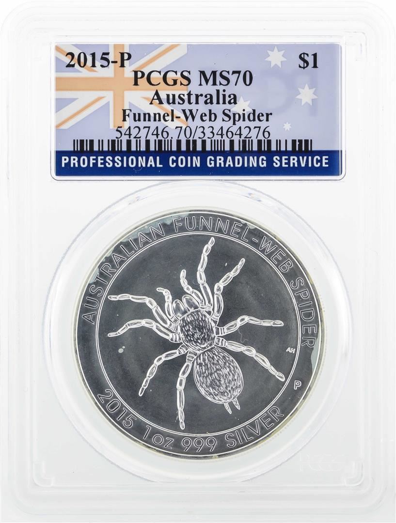 One 2015-P $1 Australia Funnel-Web Spider Silver Coin PCGS MS70. PCGS Graded.