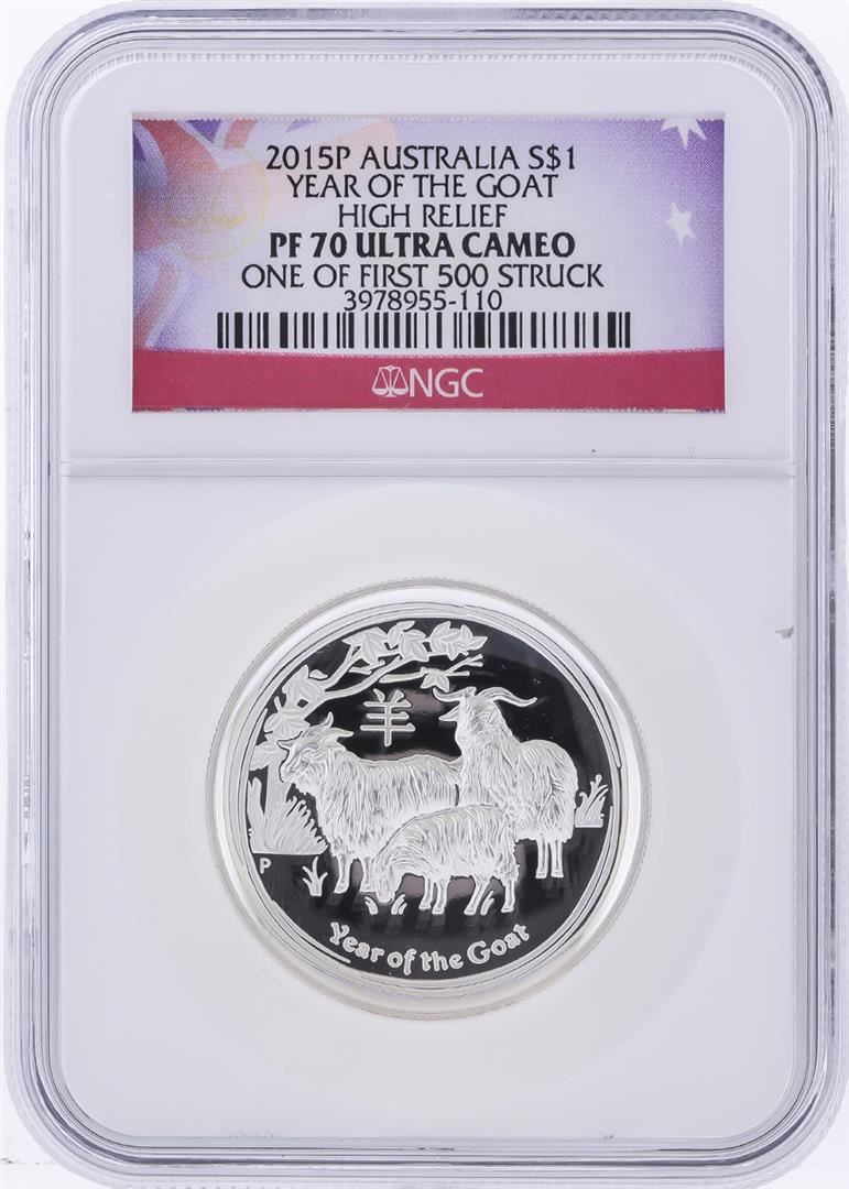 One 2015-P $1 Australia Year of the Goat High Relief Release NGC PF70 Ultra Cameo. NGC Certified.