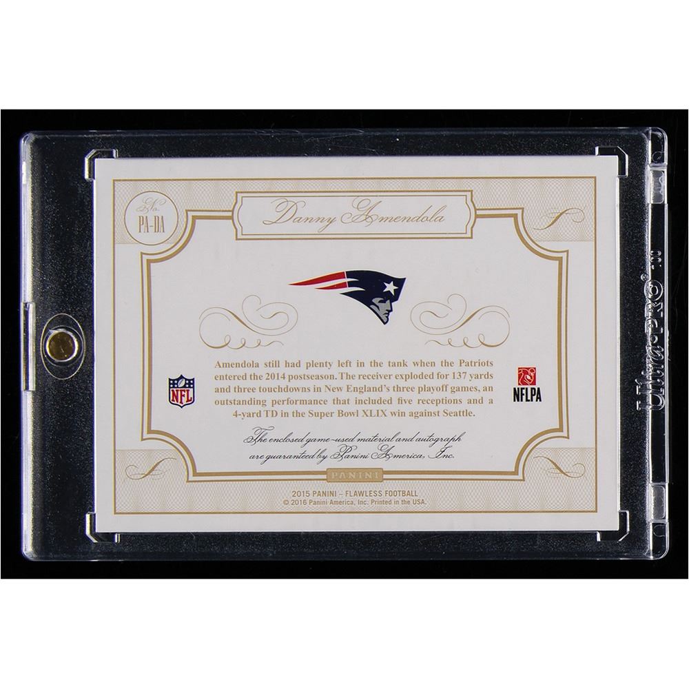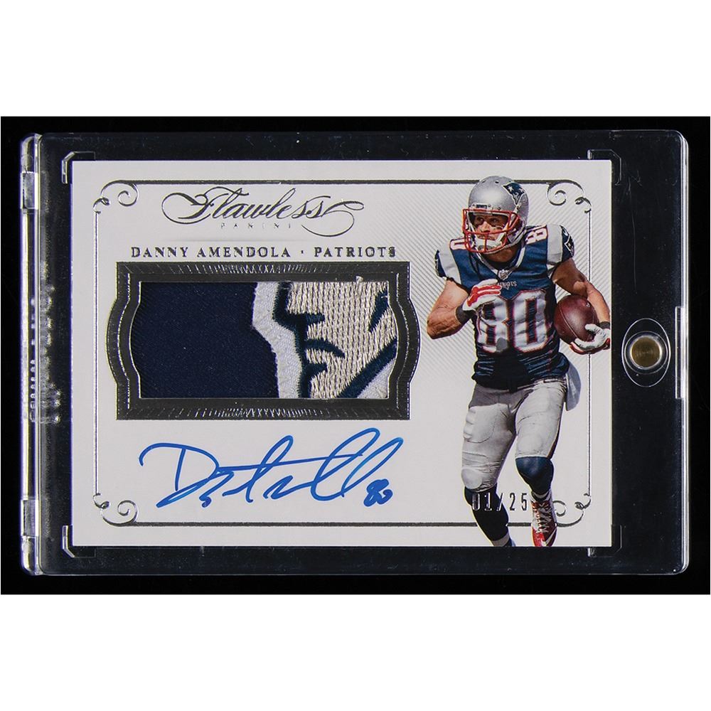 Stunning autograph/game-used patch card of New England Patriots slot receiver and playoff hero Danny Amendola, numbered 1/25, boasting a bright blue felt tip signature and a super-desirable patch from the face of the team's iconic 'Flying Elvis' logo.
