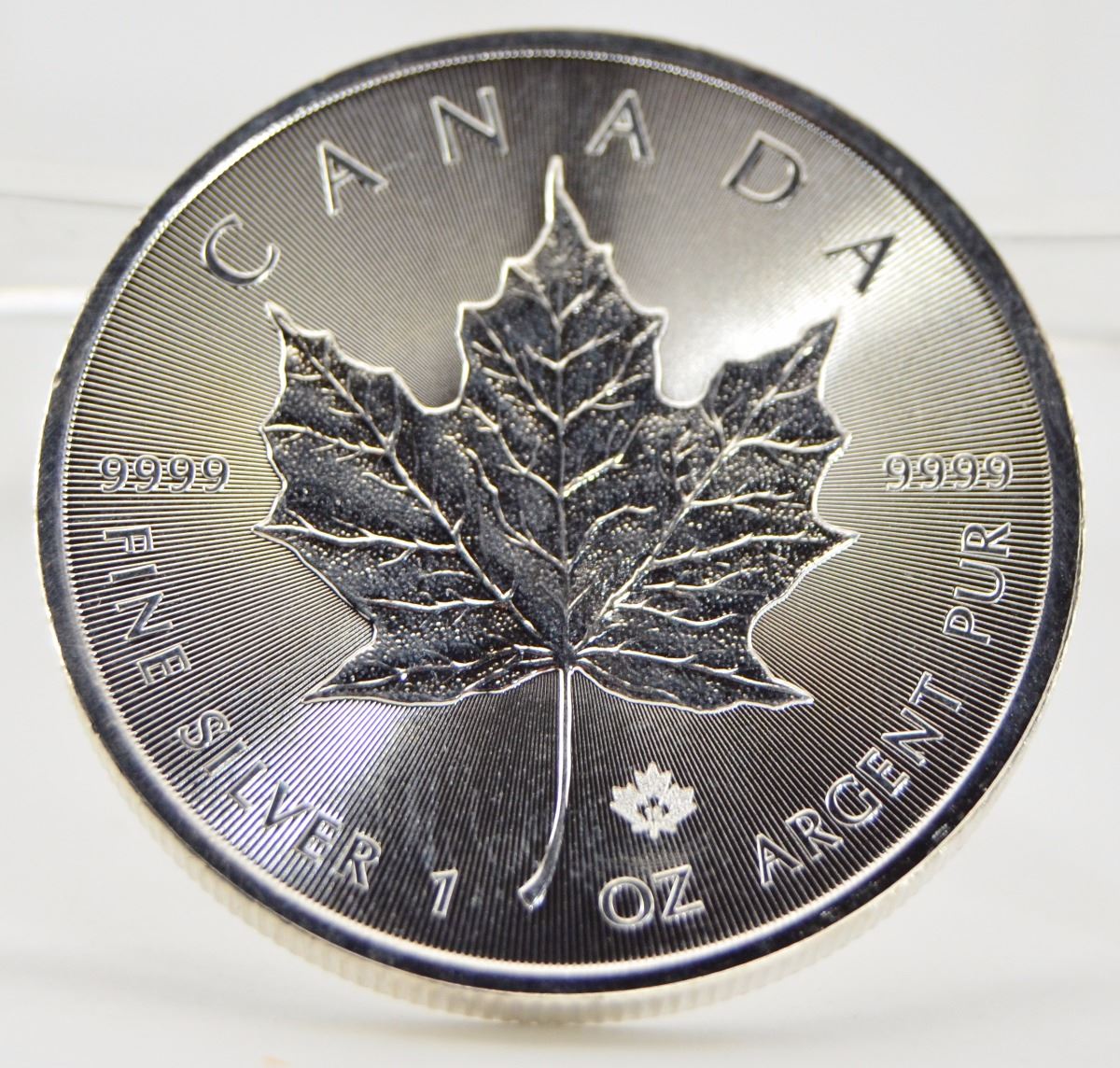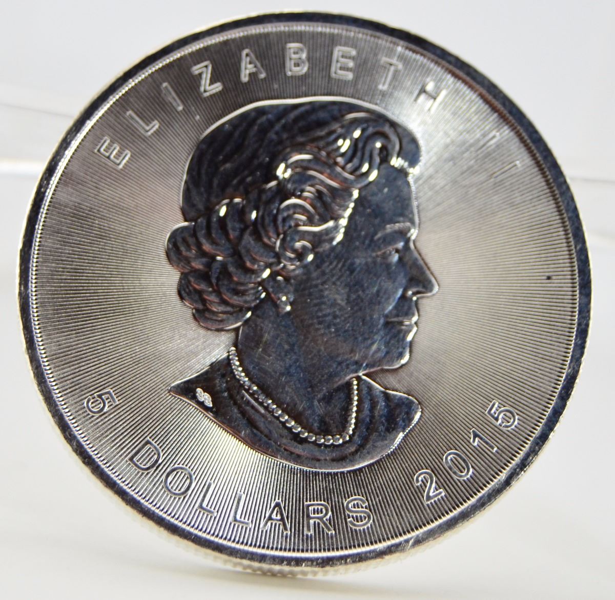 This 2015 Silver 1 ounce Maple Leaf Comes with a innovative radial background behind the queen.