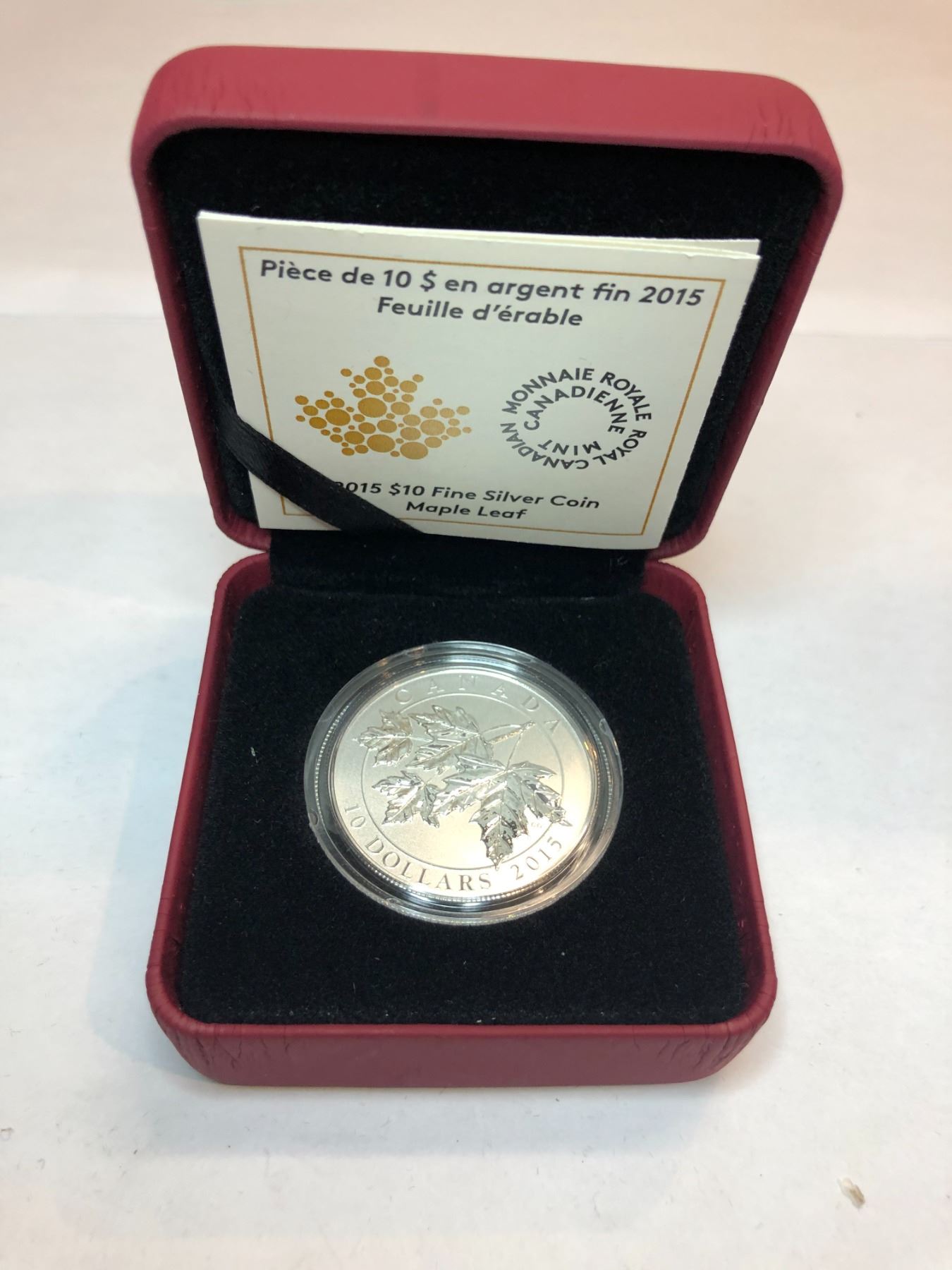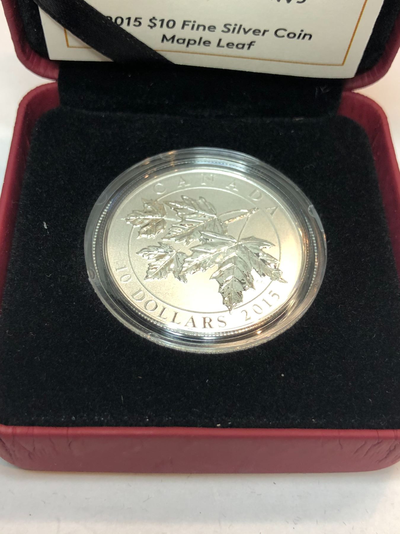 2015 Royal Canadian Mint $10 Fine Silver Coin This $10 coin is 99.99% fine silver and weighs 15.87 grams The design features several sugar maple leaves growing at the end of a twig