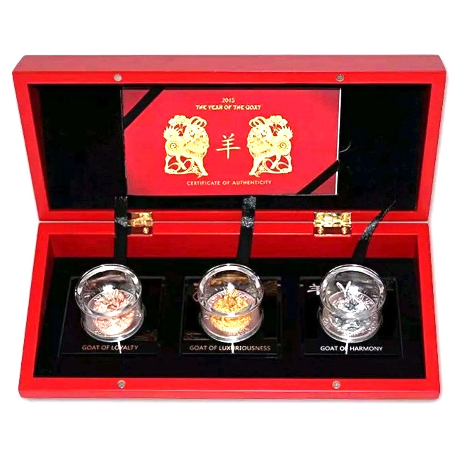 *2015 Rwanda 500 Francs Year of the Goat Three Dimensional 3-coin Fine Silver set (Tax Exempt). This set contains 3x 1oz Silver Proof 3D Sculpture coins in 24K Gold gilded, 24k Rose Gold gilded and antique Finish. Sculptures are housed in a picturesque clamshell style display case with all original mint packaging.