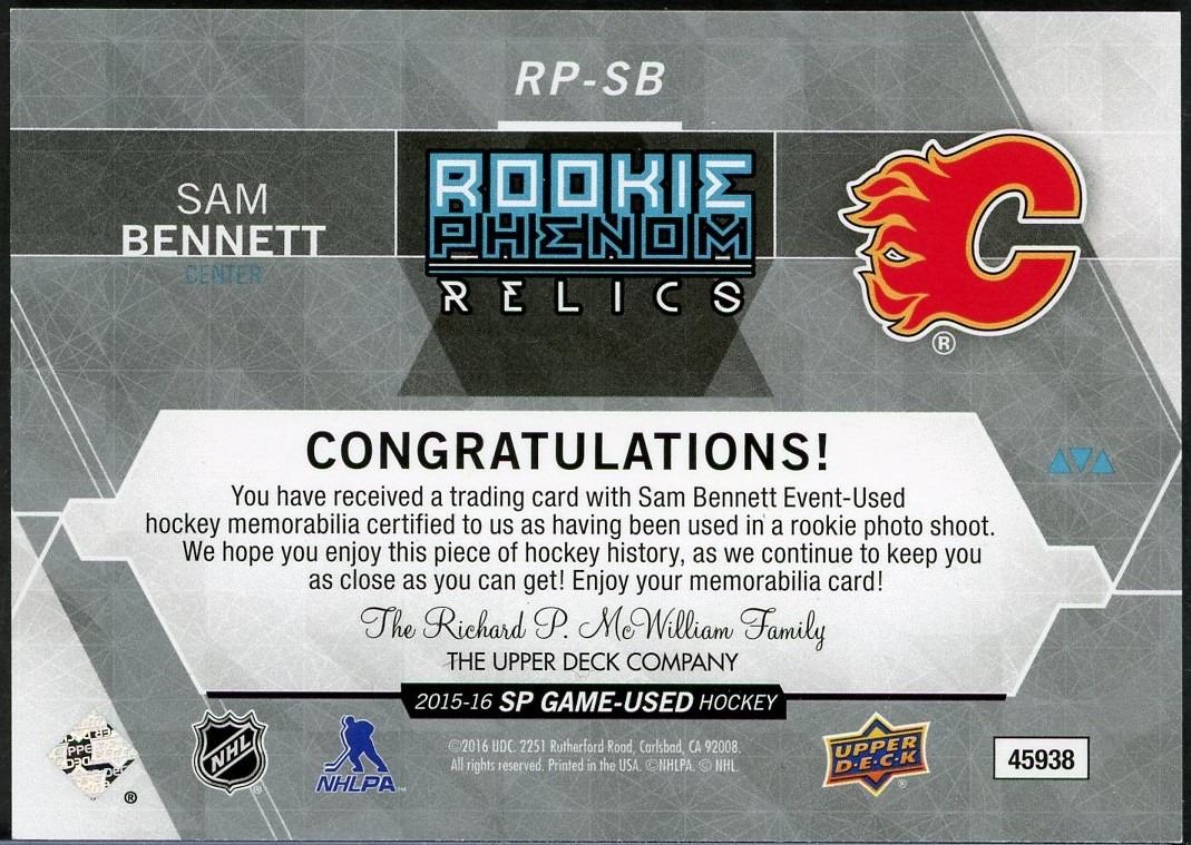 2015 UD SP Game Used rookie phenom relic patch /125 of Florida Panthers forward Sam Bennett