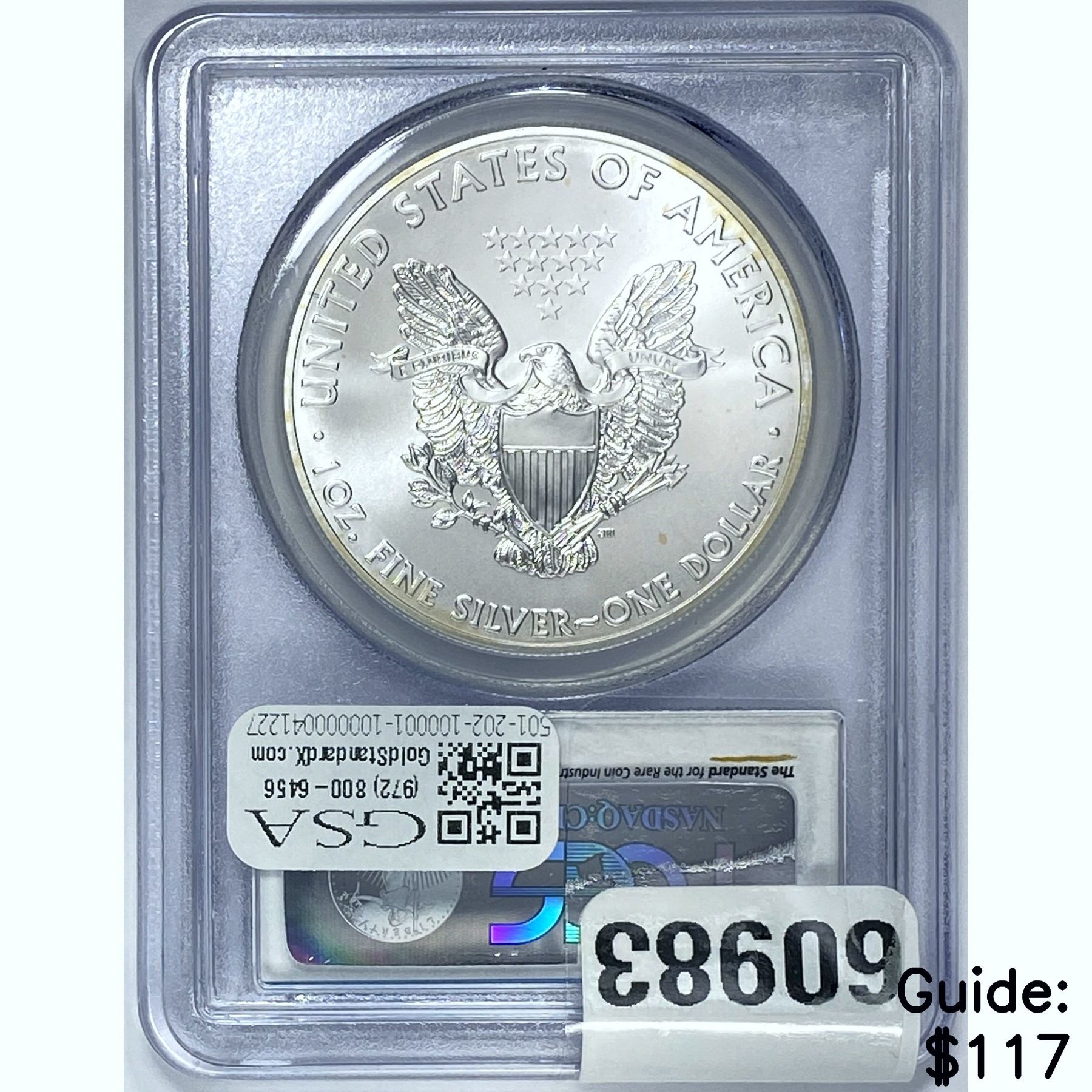 e. Coins sold referencing a third-party grading service are sold “AS IS” without any express or implied warranty, except for a guarantee by GSA that they are genuine. Removal or alteration of the holder, voids all of Bidder’s claims concerning that Product. Certain warranties may be available from the grading services and Bidders are referred to them for further details: Numismatic Guaranty Corporation (NGC), PO Box 4776, Sarasota, FL 34230, www.ngccoin.com/services/writtenguarantee.asp; Professional Coin Grading Services (PCGS), PO Box 9458, Newport Beach, CA 92658, www.pcgs.com/guarantee.html; ANACS, 6555 S. Kenton St., Ste. 303, Englewood, CO 80111; and Independent Coin Grading Co. (ICG), 7901 East Bellview, Ave., Suite 50, Englewood, CO 80111.