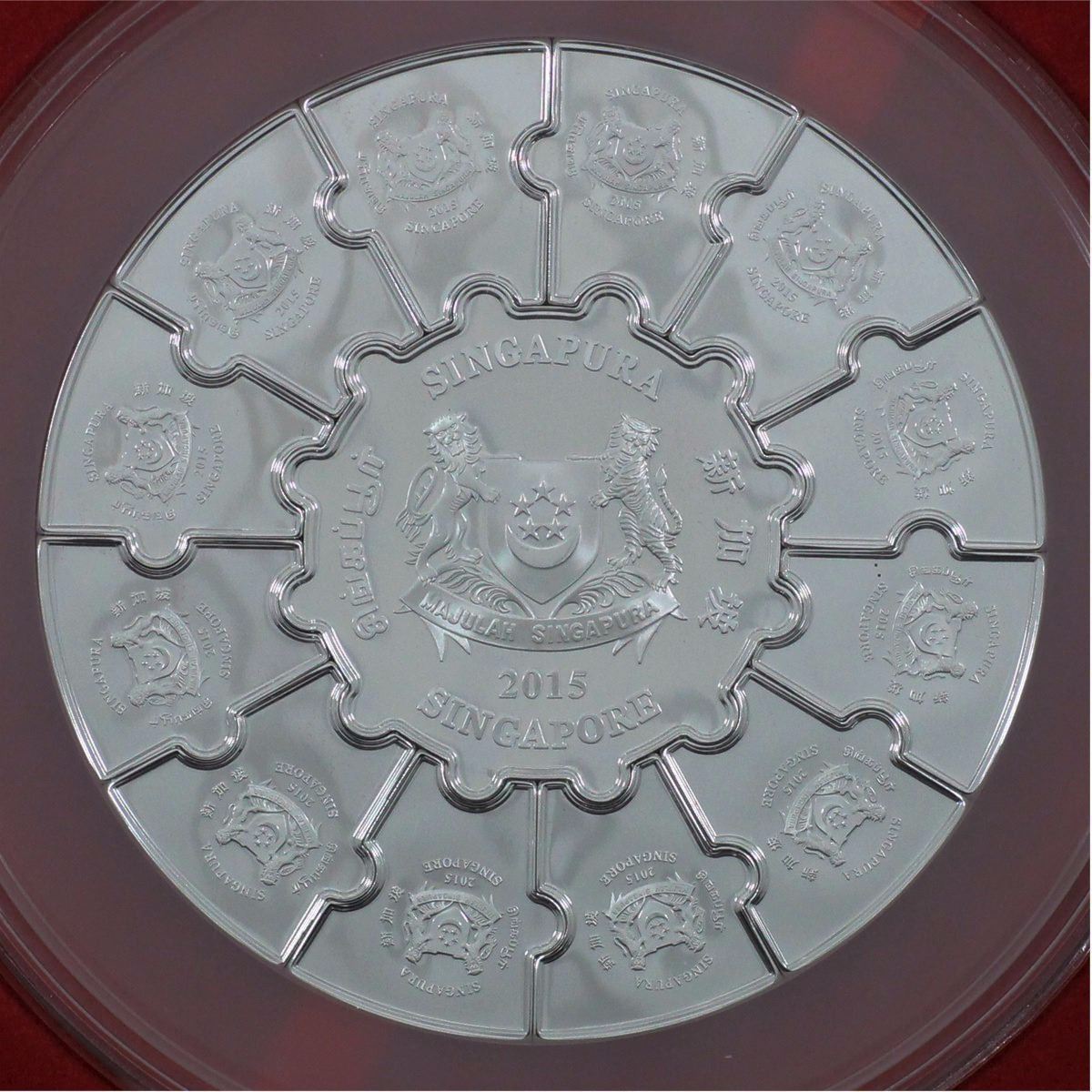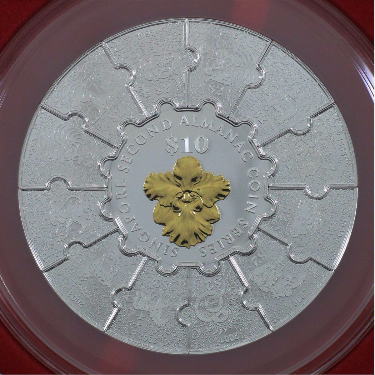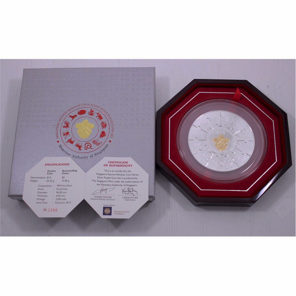 2015 Singapore Second Almanac coin Series 13-coin Silver Puzzle set with all original Mint display packaging. (Tax Exempt) The Singapore Second Almanac Coin Series Puzzle Coin Set comprises a 2oz .999 Fine Silver coin in the centre, surrounded by twelve 1/2oz .999 Fine Silver coins, featuring each of the 12 animals depicted on the second Series of each almanac coins. The centre coin features the national flower of Singapore, the Vanda miss Joaquim plated in Gold to Commemorate Singapore's Golden Jubilee in 2015. The coins are joined together using a 3-way interlocking concept to form a circle. only 2000 of these ser were issued world wide. Buyers Premium will be added on all items as per our terms of sale. We accept Paypal, Credit Card, E-Transfer Payments, Cheque or Money Orders (there is an additional 3% fee for using Paypal or Credit Card). All invoices will be emailed immediately following the auction, please contact us if you would like to pay by credit card or receive a new revised lower total for mailing in payment or sending an e-transfer (3% discount). All Items Are Sold "AS IS", no returns