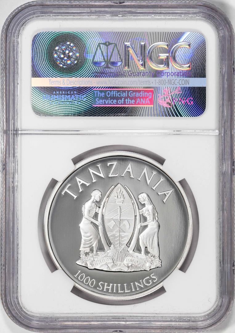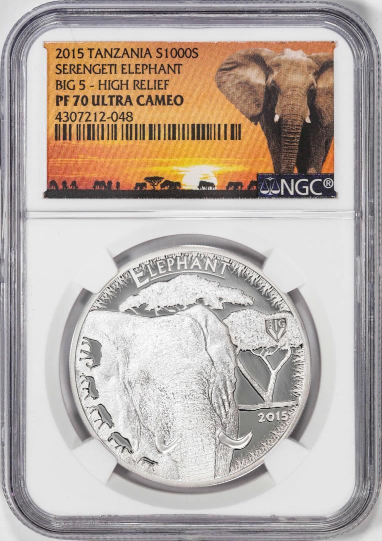 One 2015 Tanzania 1000 Shillings Serengeti Elephant Big 5 Silver Coin NGC PF70 Ultra Cameo. NGC Certified.
