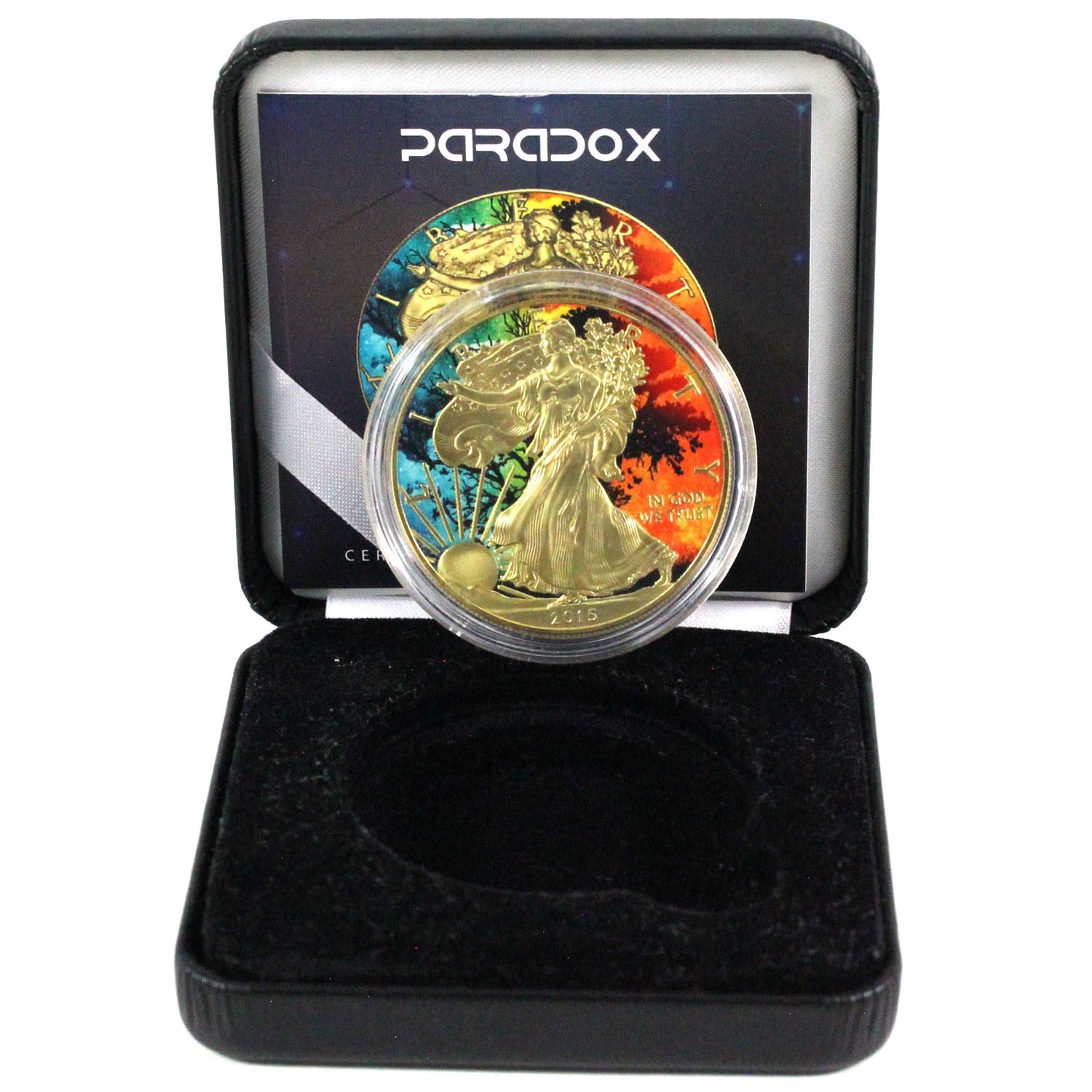 2015 USA 1oz Paradox Coloured & Gilded .999 Fine Silver Eagle Encapsulated in Smitty's Treasures Display Box with COA #067/500. (TAX Exempt)