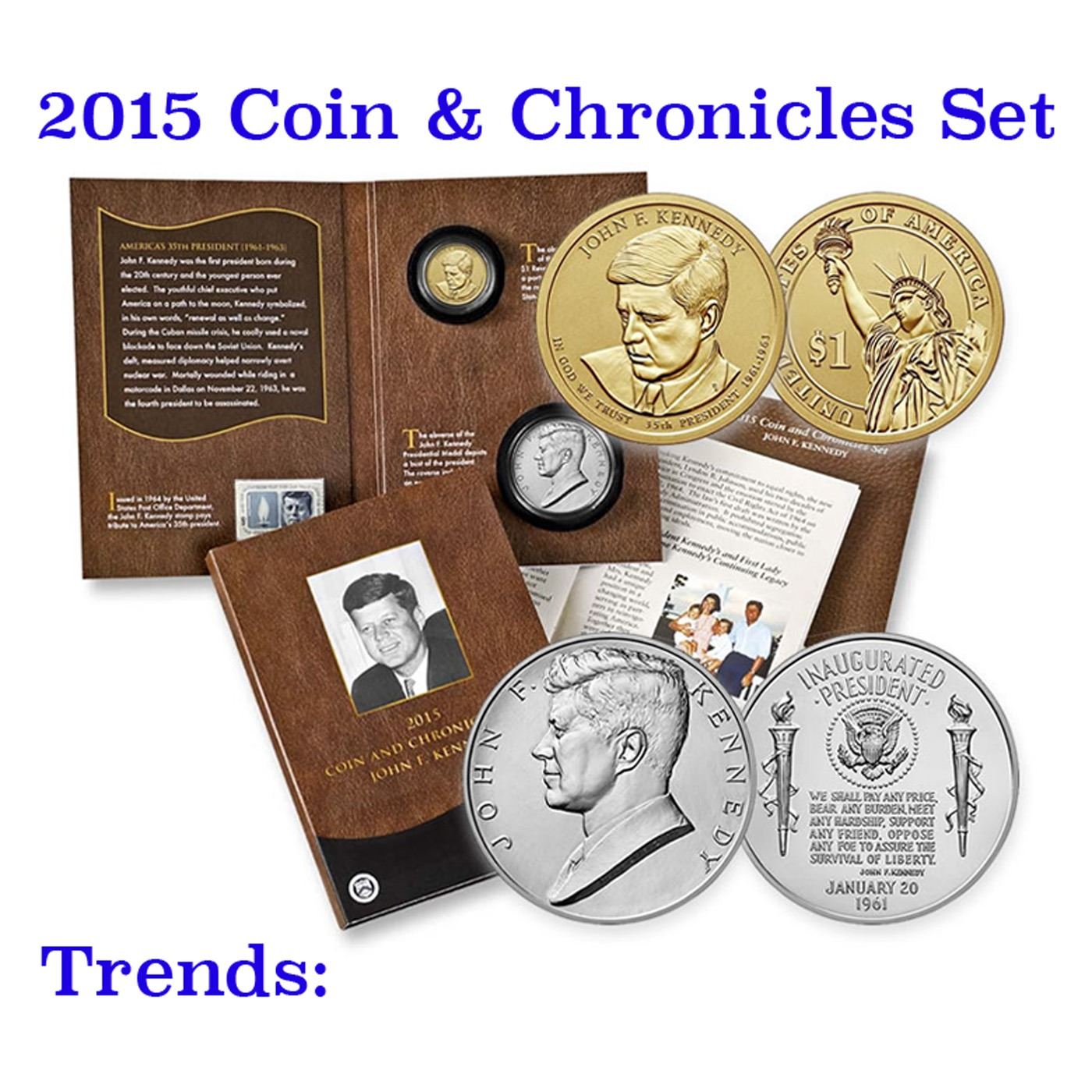 2015 United States Mint Coin and Chronicles Set John F. Kennedy. John F. Kennedy features a Presidential $1 Reverse Proof Coin (only found in this set!) and a 1 ounce Kennedy Presidential Silver medal. Also included is a vintage U.S. postage stamp paying tribute to President Kennedy, plus a booklet with images from Kennedy's life and presidency.