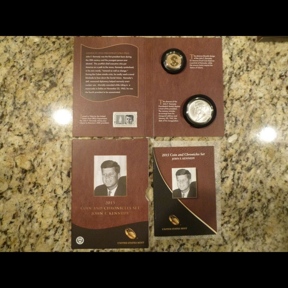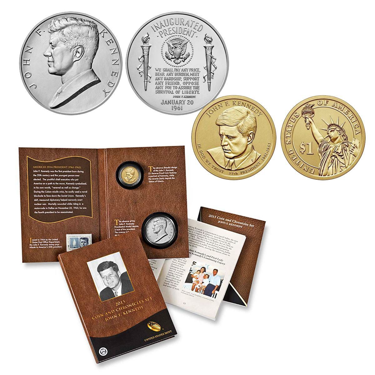 2015 United States Mint John F. Kennedy Coin & Chronicle Set . .. This set features a Presidential $1 Reverse Proof Coin and a Kennedy Presidential Silver Medal. The set also includes a U.S. postage stamp issued in 1964. Obverse: The medal features a portrait of John F. Kennedy with the inscription “JOHN F. KENNEDY” centered along the border of the medal. The reverse of the medal features the inscription “INAUGURATED PRESIDENT” centered at the top of the medal and “JANUARY 20, 1961” centered along the bottom of the medal. Also, included is the Presidential Seal with the burning torches of liberty on each side with the following excerpt from the President’s Inaugural Address: “WE SHALL PAY ANY PRICE, BEAR ANY BURDEN, MEET ANY HARDSHIP, SUPPORT ANY FRIEND, OPPOSE ANY FOE TO ASSURE THE SURVIVAL OF LIBERTY. JOHN F. KENNEDY.” The design of this Presidential $1 coin features a forward facing portrait of John F. Kennedy. Inscriptions are “JOHN F. KENNEDY,” “IN GOD WE TRUST,” “35th PRESIDENT” and “1961 – 1963.” Reverse: The design of the Presidential $1 Coin depicts a striking rendition of the Statue of Liberty. This coin’s designs feature large, dramatic artwork, as well as edge–incused inscriptions of the year of minting or issuance, “E PLURIBUS UNUM” and the mintmark. “IN GOD WE TRUST” appears on the face of the coin.