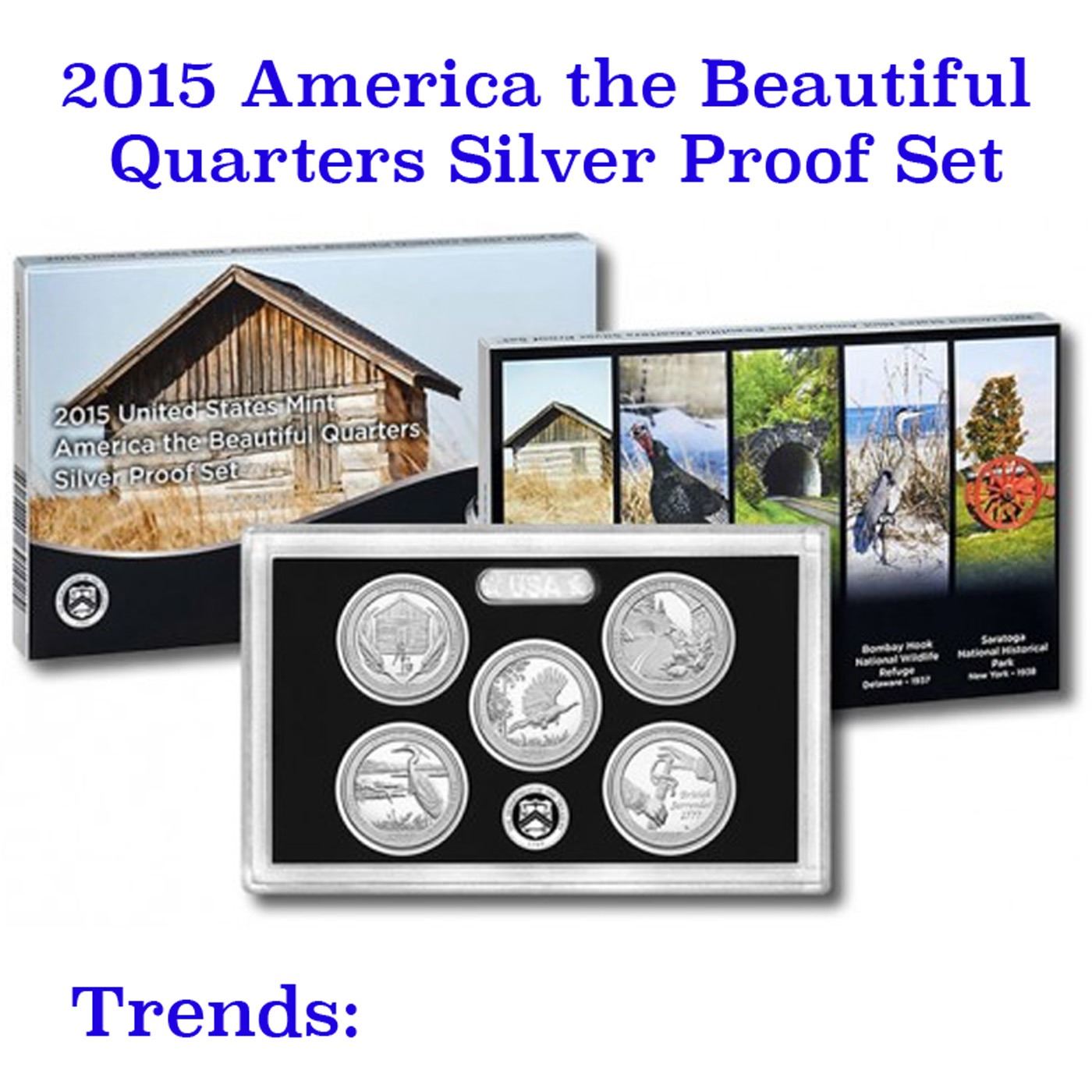 2015 United States Quarters America the Beautiful Silver Proof Set - 5 pc set . The Set contains 5 90% Silver America the Beautiful Proof Quarters honoring Homestead National Monument of America (Neb.), Kisatchie National Forest (La.), Blue Ridge Parkway (N.C.), Bombay Hook National Wildlife Refuge (Del.), and Saratoga National Historical Park (N.Y.). All coins were struck at the United States Mint at San Francisco in 90 percent silver. The obverse (heads side) of the coins bear John Flanagan’s 1932 portrait of George Washington.. About 1oz of pure Silver