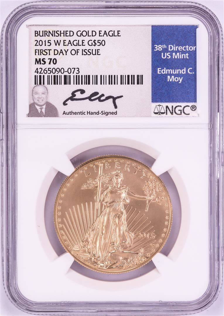 One 2015-W $50 Burnished American Gold Eagle Coin NGC MS70 FDOI Moy Signature. NGC Certified.