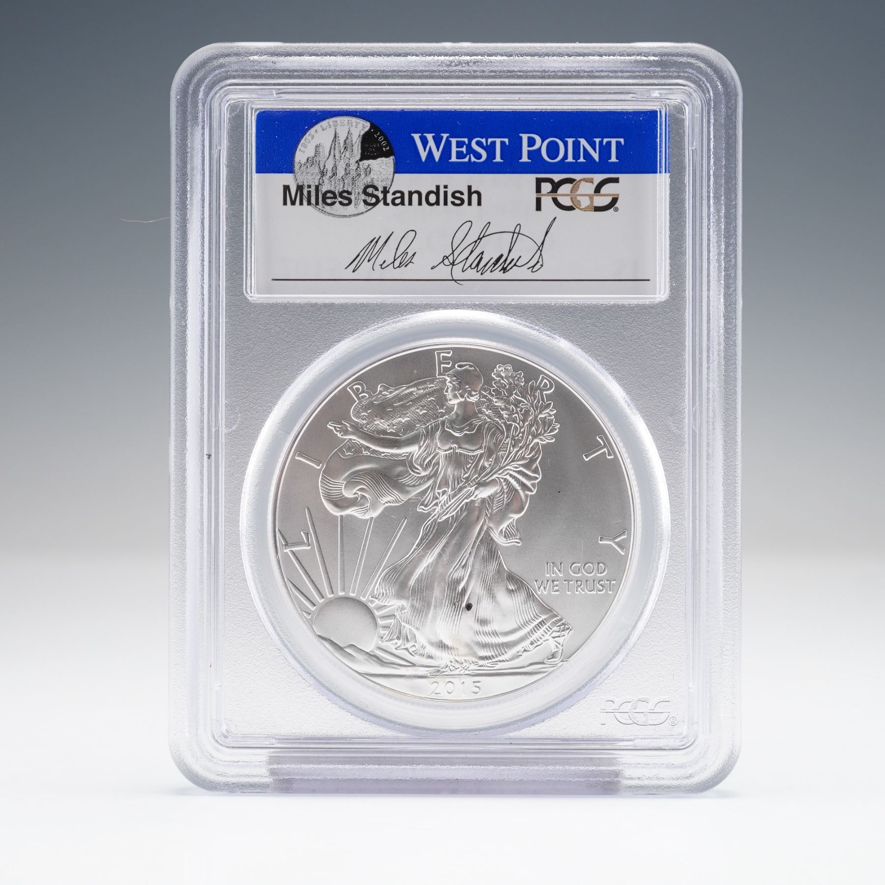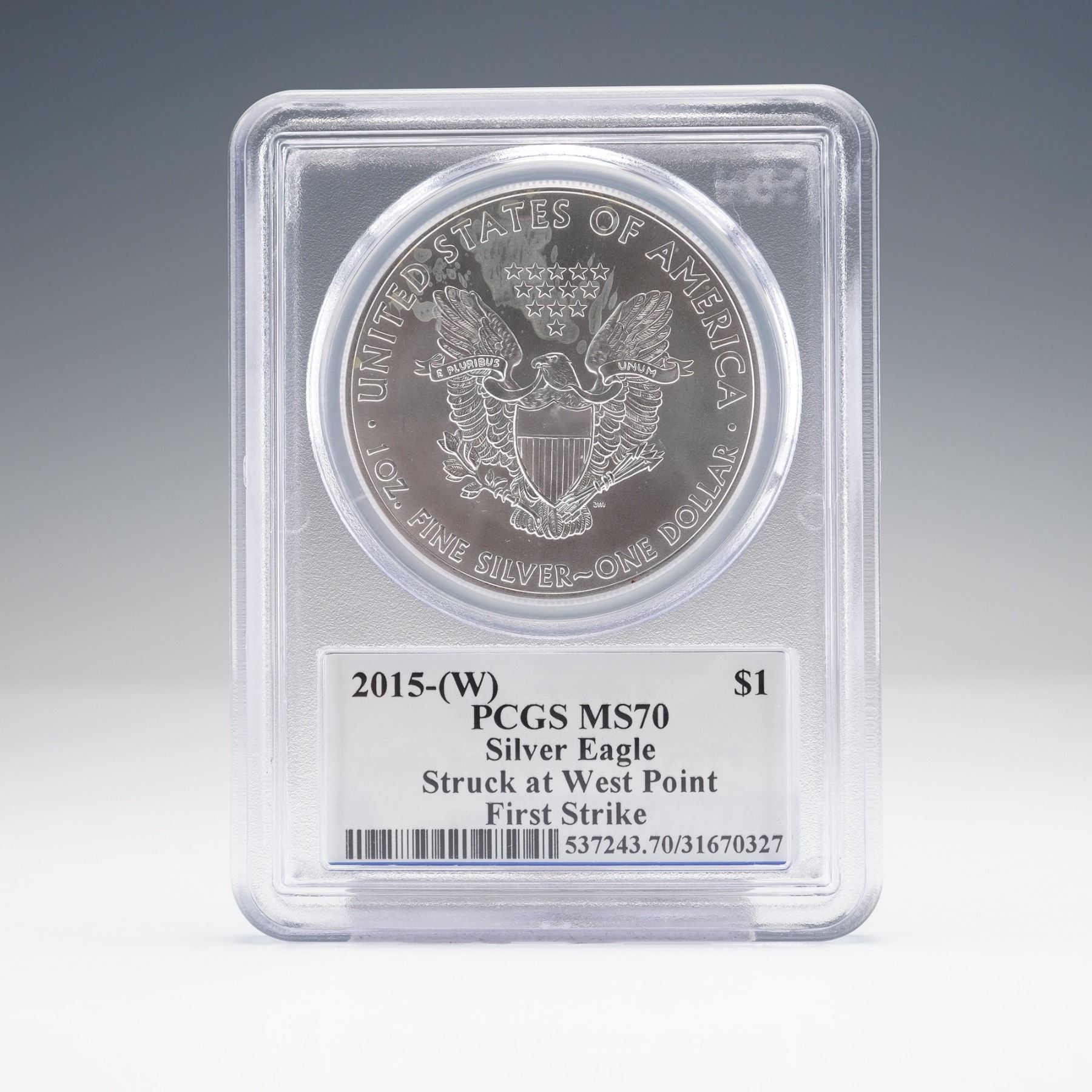 This 2015-(W) American Silver Eagle one-dollar coin, struck at the West Point Mint from one troy ounce of .999 fine silver, has been graded MS70 by the Professional Coin Grading Service. It bears the coveted "First Strike" designation. The obverse features Adolph A. Weinman's iconic Walking Liberty, depicted in full stride toward the sunrise with the American flag billowing around her and laurel and oak branches in her arm, symbolizing strength, honor, and peace, followed by LIBERTY, IN GOD WE TRUST, and the year below. The reverse, designed by John M. Mercanti, displays the heraldic eagle clutching arrows and an olive branch, its outstretched wings beneath a constellation of thirteen stars representing the founding colonies. It is surrounded by UNITED STATES OF AMERICA, 1 oz. FINE SILVER - ONE DOLLAR. Encapsulated and certified by PCGS for authenticity and preservation.