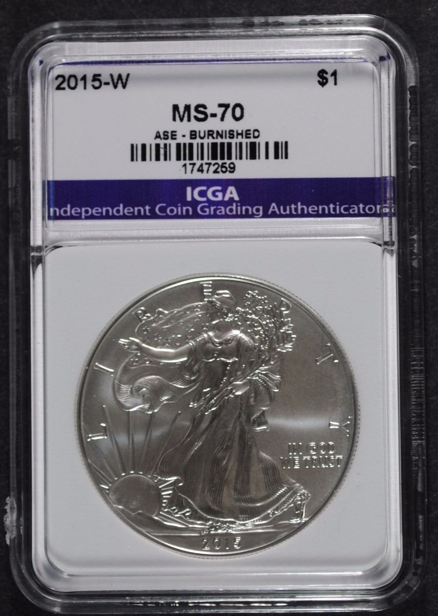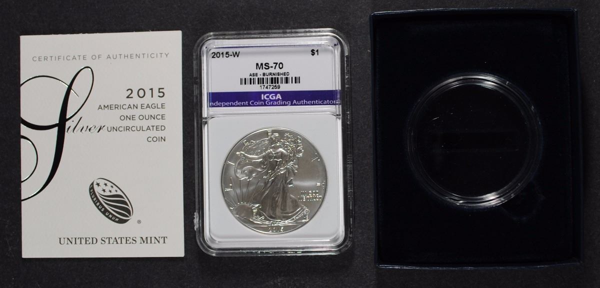 2015-W BURNISHED AMERICAN SILVER EAGLE ICGA PERFECT GEM BU, WITH ORIG BOX/COA