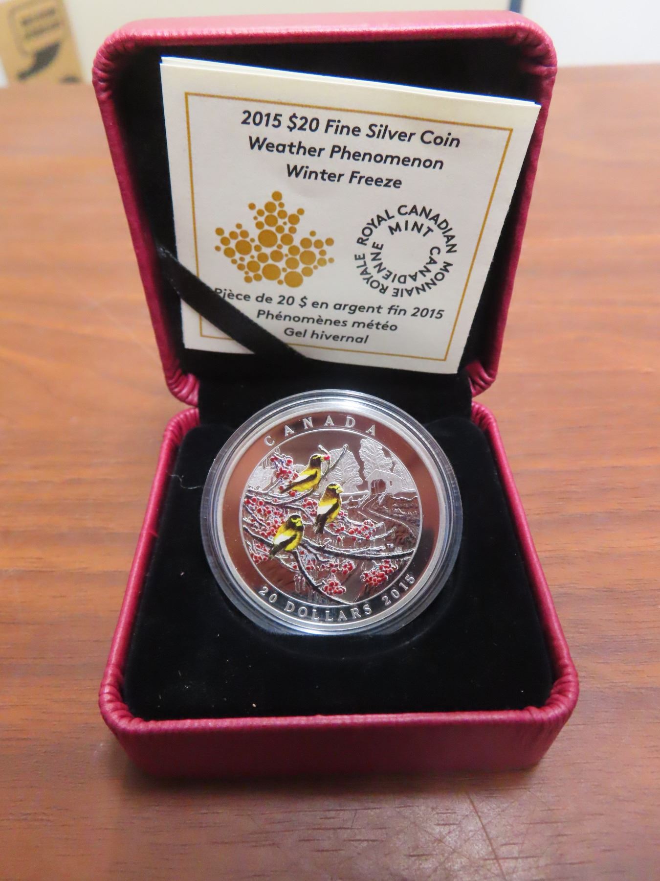 2015 Weather Phenomenon: Winter Freeze. Coloured evening grossbeaks eating frozen berries. 99.99% pure Silver. Proof with Ultra Heavy Cameo. Housed in its original Royal Canadian Mint case & box of issue. Includes Certificate of Authenticity.