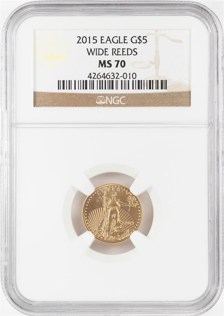 One 2015 Wide Reeds $5 American Gold Eagle Coin NGC MS70. NGC Certified.