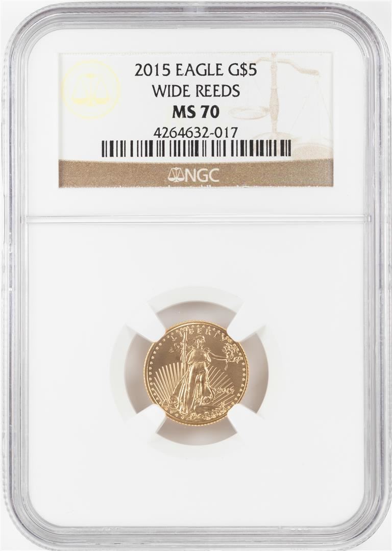 One 2015 Wide Reeds $5 American Gold Eagle Coin NGC MS70. NGC Certified.
