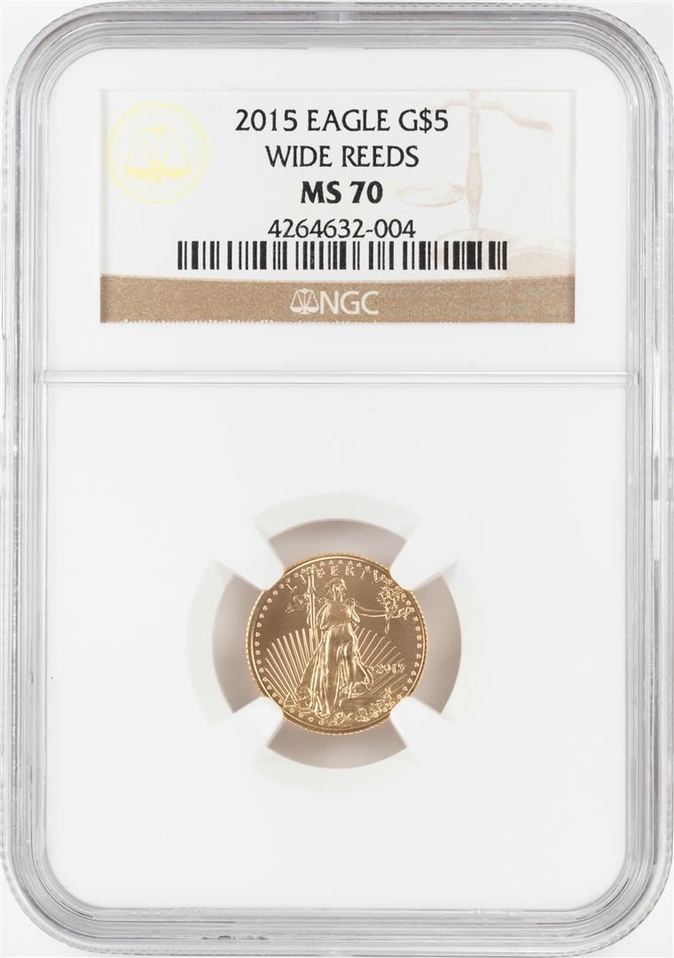 One 2015 Wide Reeds $5 American Gold Eagle Coin NGC MS70. NGC Certified.