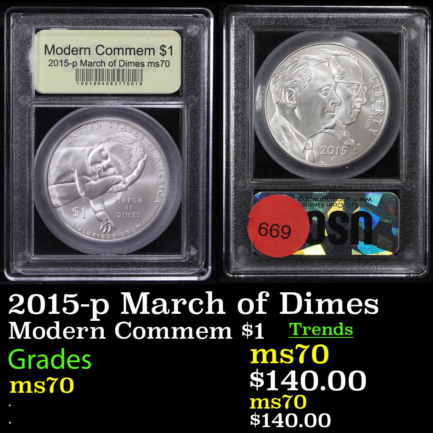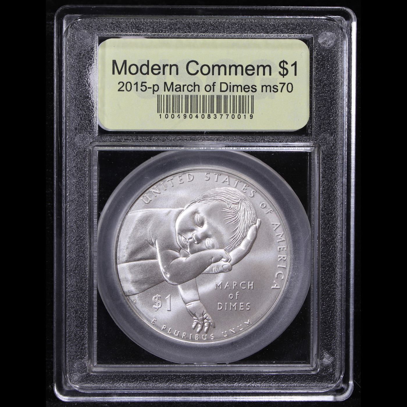 2015-p March of Dimes Modern Commem Dollar $1 Graded ms70, Perfection by USCG. The U.S. Mint released the March of Dimes Silver Dollar Coin in recognition of the 75th anniversary of the March of Dimes Foundation. The obverse and reverse designs are emblematic of the mission and programs of the Foundation and its distinguished record of generating Americans’ support to protect children’s health. Consistent with the traditions and heritage of the Foundation, the design themes represent the Foundation’s past, present, and future and its role as champion for all babies.