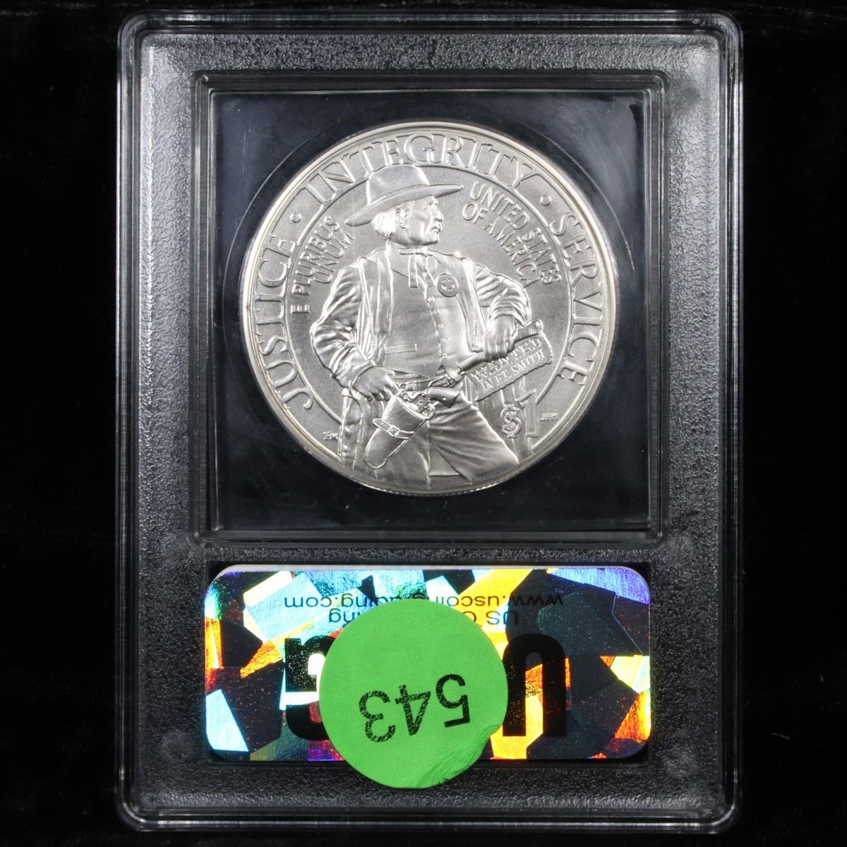 2015-p U.S. Marshals Service Modern Commem Dollar $1 Graded ms70, Perfection By USCG. The 2015 US Marshals Service Silver Dollar was one of three coins issued to celebrate the 225th anniversary of the nation’s first federal law enforcement agency. The designs for the coin focused on the legendary status of the United States Marshals in America’s cultural landscape. The obverse design of the coin features an image of the US Marshals Service Star with the silhouette of US Marshals riding horses across the lower portion. The inscriptions include “Liberty”, the anniversary dates “1789-2014”, the motto “In God We Trust”, and the date of issue “2015”. The obverse was designed by Richard Masters and engraved by Charles Vickers. On the reverse is a depiction of a frontier U.S. Marshal leaning against a post and holding a “wanted” poster. This image is intended to represent Marshals as the lawmen of the frontiers, playing an important role in their geographic, political, and cultural history. An inscription above the image includes the words of the Marshals Service motto “Justice, Integrity, Service”. Additional inscriptions include “E Pluribus Unum”, “United States of America”, and the denomination “$1”. The reverse was designed by Frank Morris and engraved by Joseph Menna.
