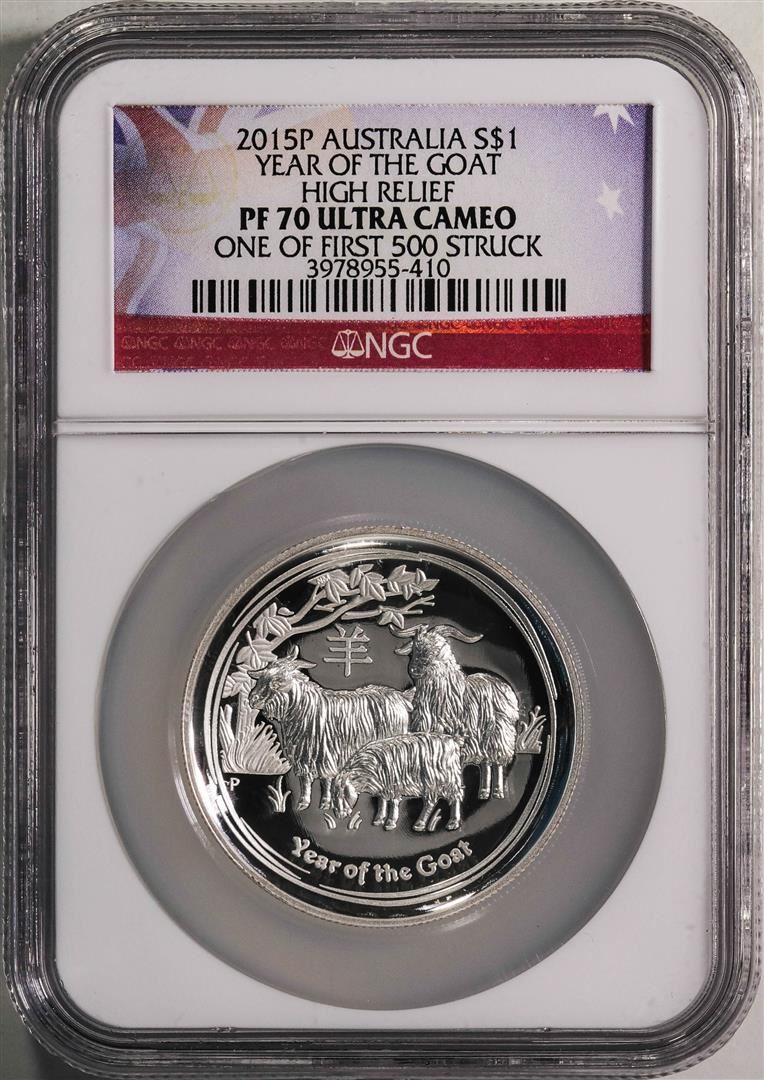 One 2015P $1 Proof Australia Year of the Goat High Relief Silver Coin NGC PF70 Ultra Cameo. NGC Certified.