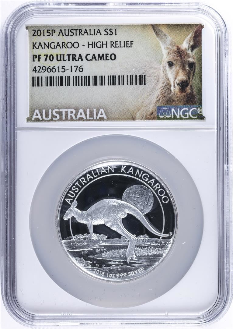 One 2015P Australia $1 Proof Kangaroo High Relief 1oz Silver Coin NGC PF70 Ultra Cameo. NGC Certified.