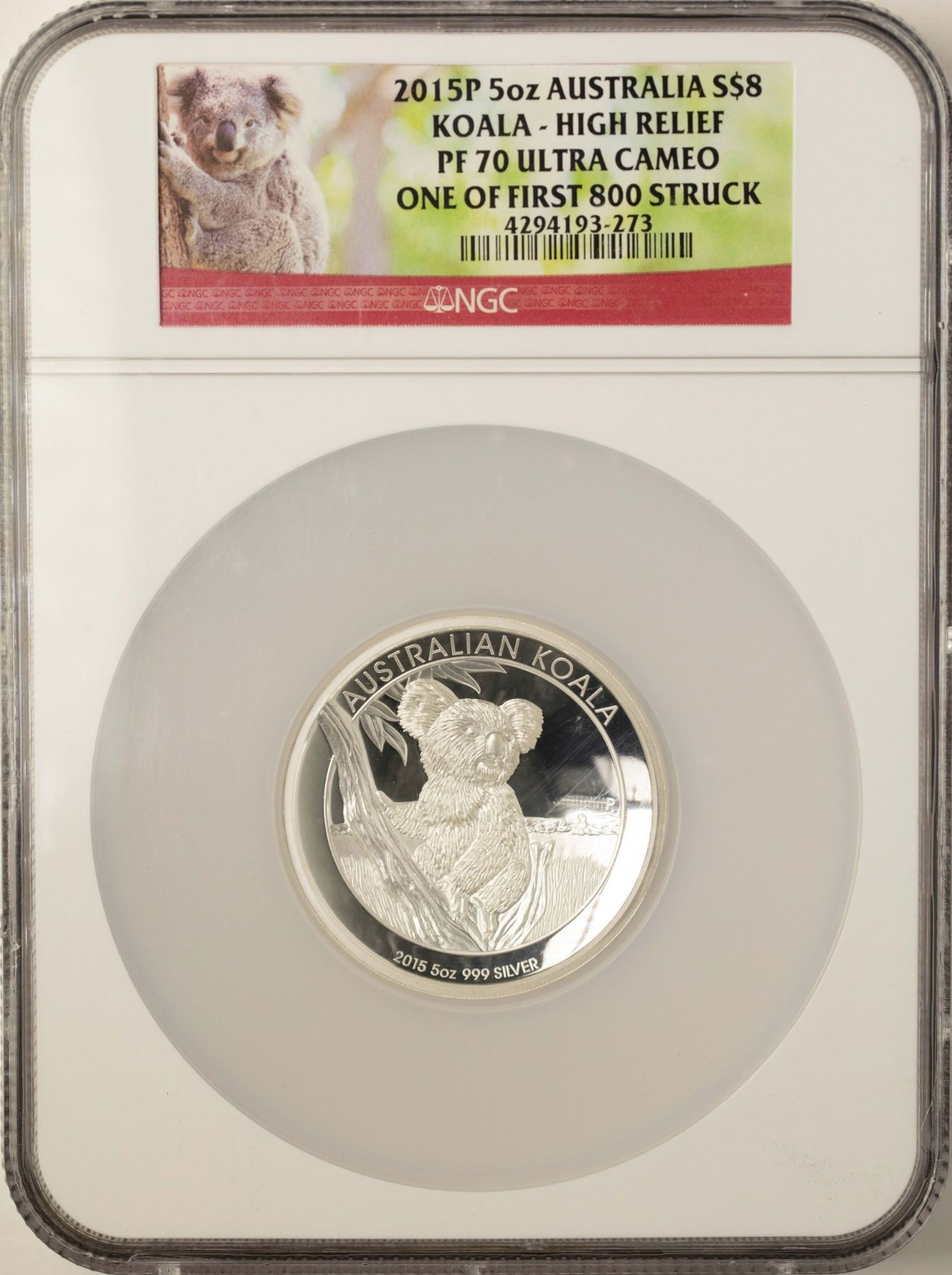 One 2015P Australia $8 Proof Koala High Relief 5 oz. Silver Coin NGC PF70 Ultra Cameo.