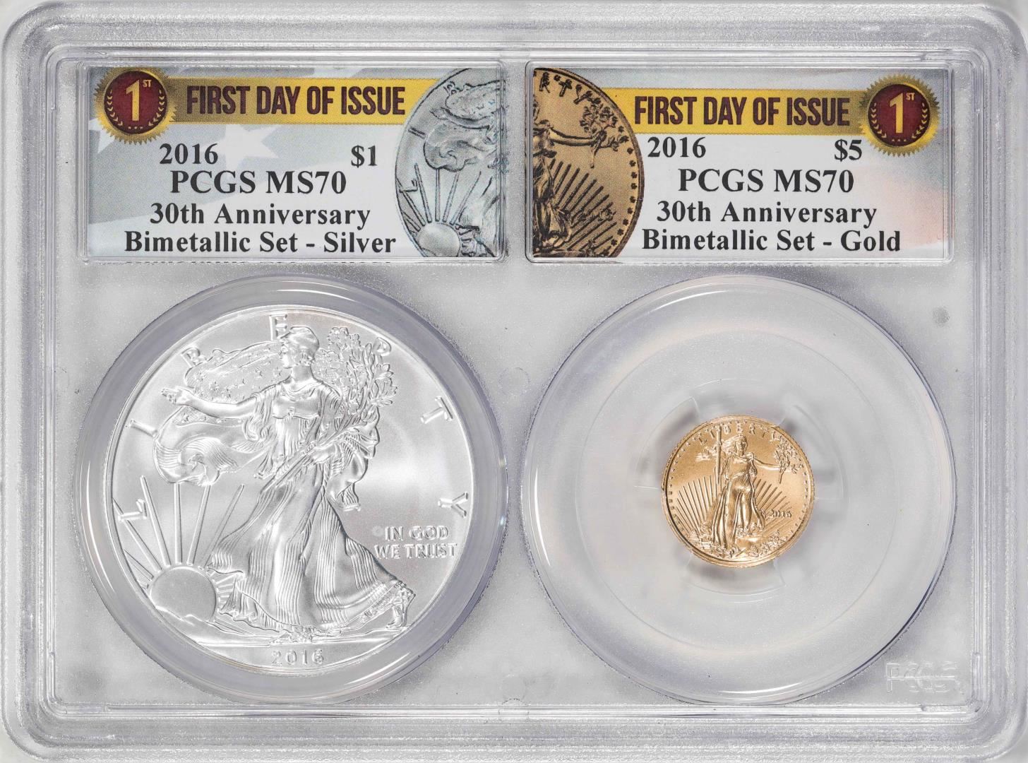 2016 $1 American Silver & $5 Gold Eagle 30th Anniversary Bimetallic Set PCGS MS70 FDOI