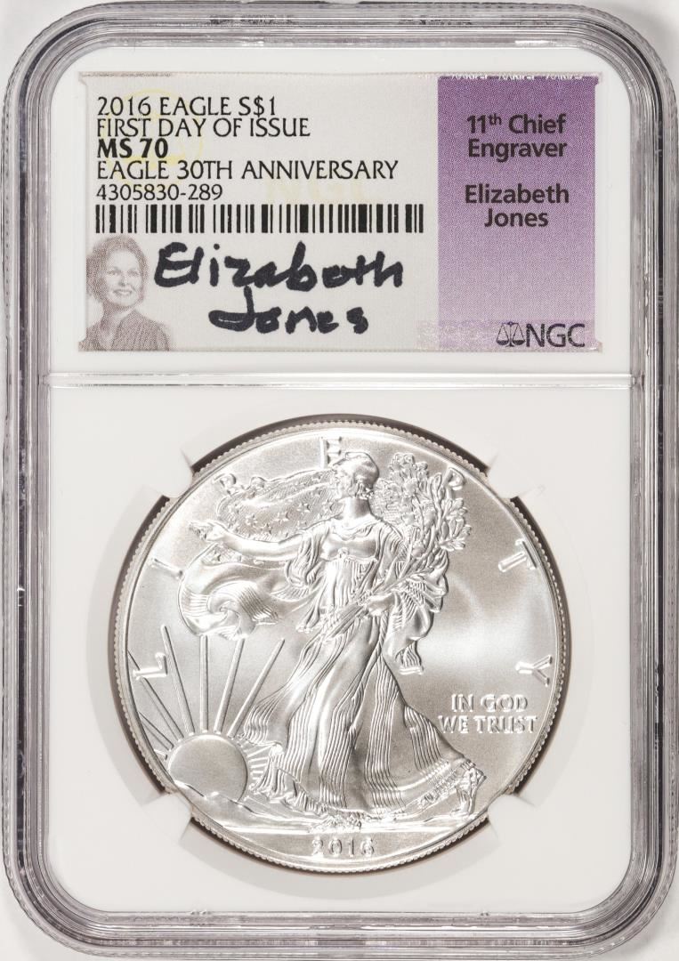 One 2016 $1 American Silver Eagle Coin NGC MS70 FDOI Jones Signature 30th Anniversary. NGC Certified.