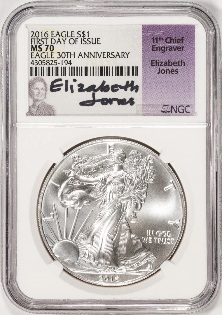 One 2016 $1 American Silver Eagle Coin NGC MS70 FDOI Jones Signature 30th Anniversary. NGC Certified.