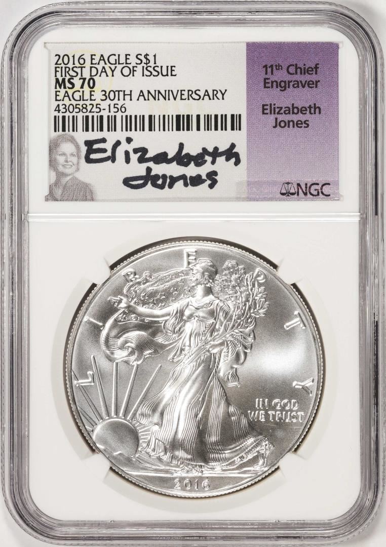 One 2016 $1 American Silver Eagle Coin NGC MS70 FDOI Jones Signature 30th Anniversary. NGC Certified.