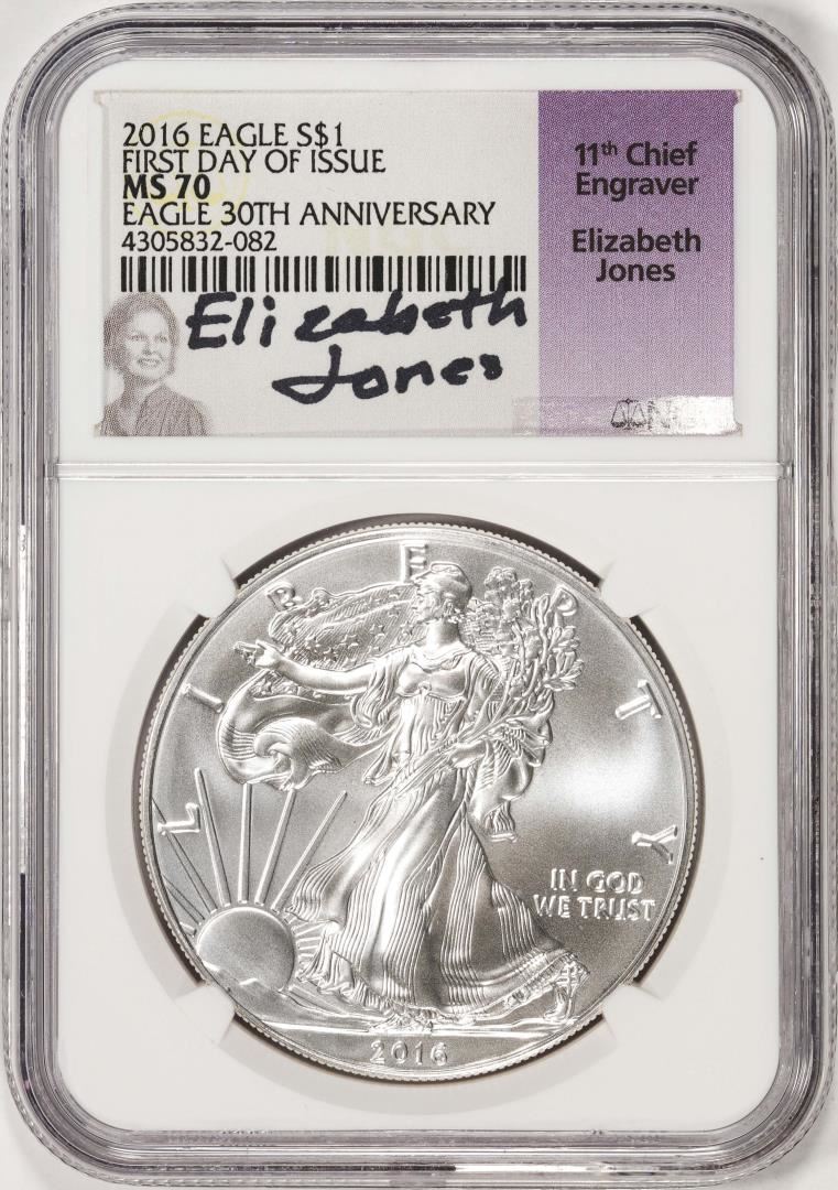 One 2016 $1 American Silver Eagle Coin NGC MS70 FDOI Jones Signature 30th Anniversary. NGC Certified.