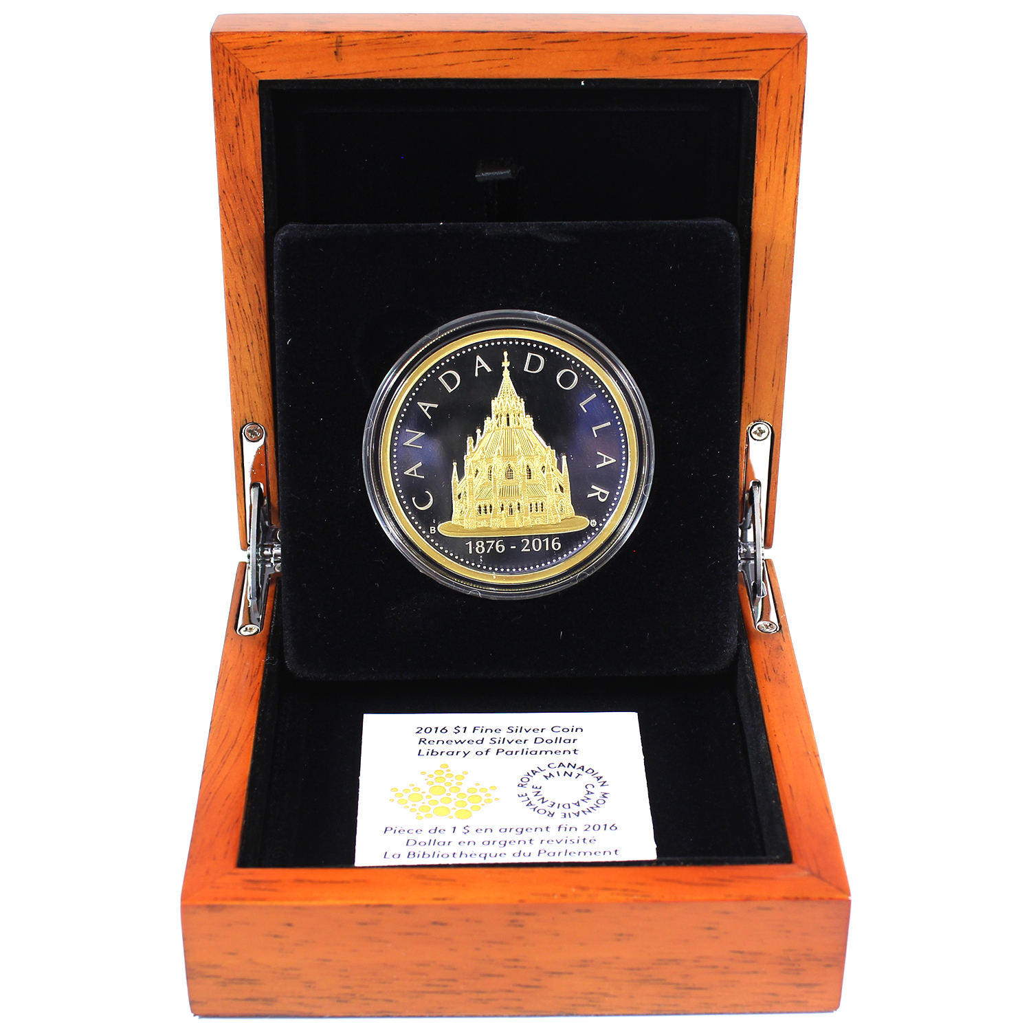 2016 $1 Renewed Silver Dollar - Library of Parliament Fine Silver Coin w/ Selective Gold Plating