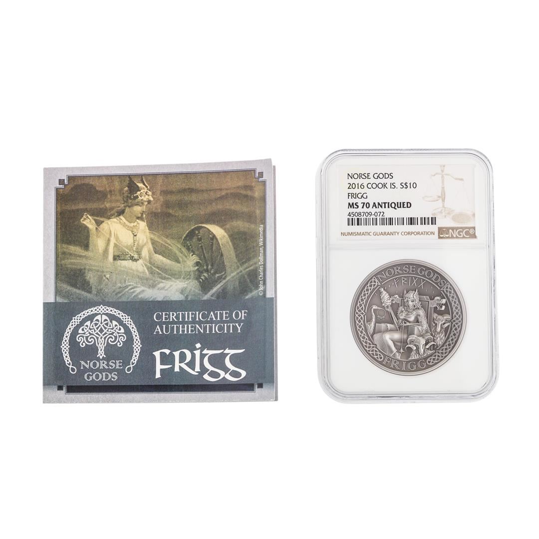 One 2016 $10 Cook Islands Norse Gods Frigg Silver Coin NGC MS70 Antiqued. NGC Certified.