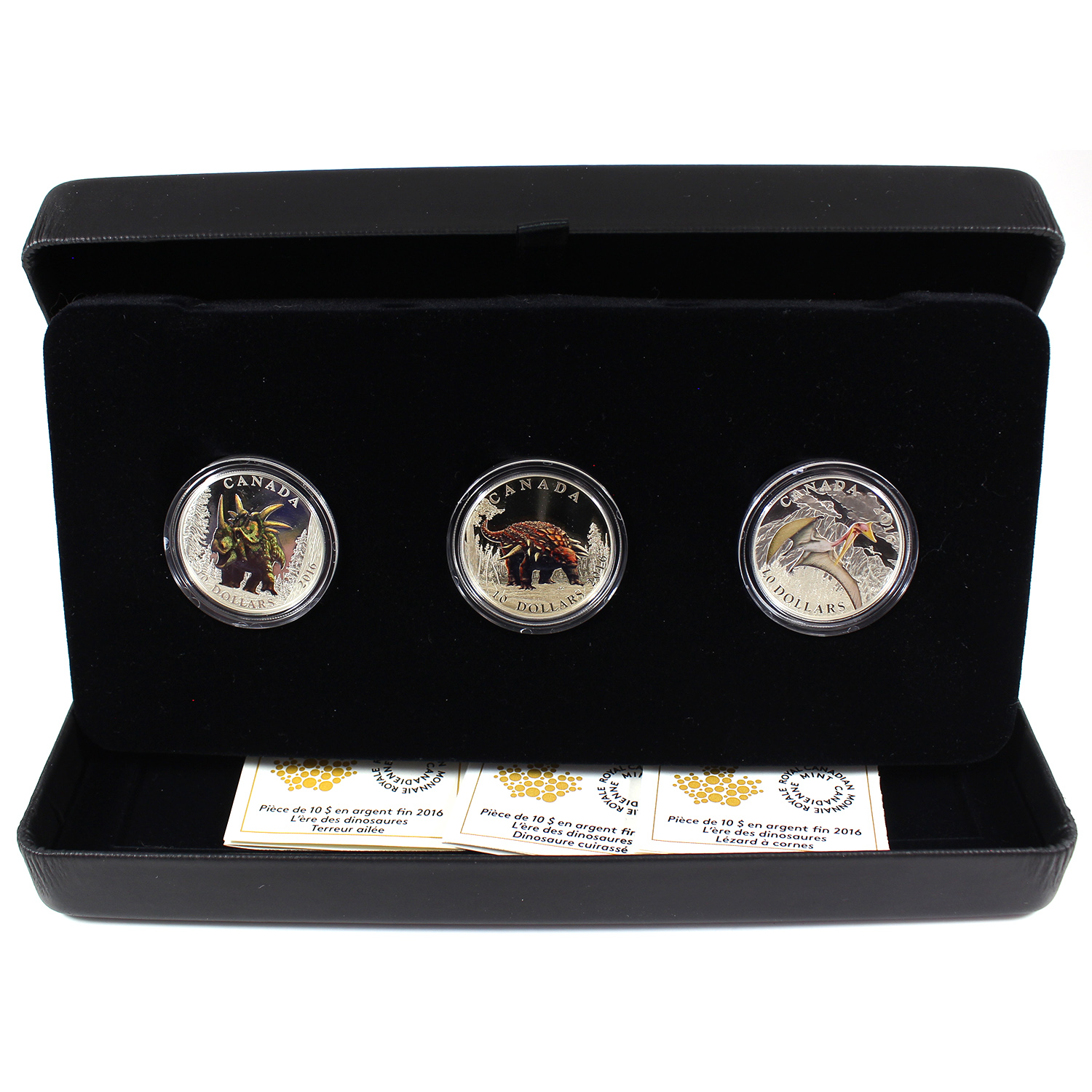Each coin depicts an iconic dinosaur of the past in a selectively coloured design. Coins have varying levels of natural toning (Tax Exempt)