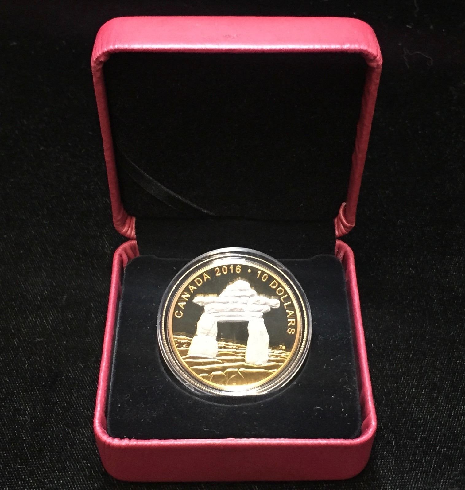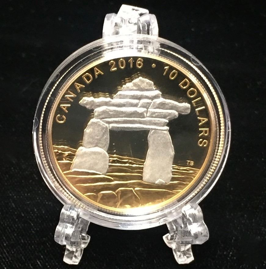 Lot 384; Fine Silver .9999 2016 $10 Inukshuk - Iconic Canada Reverse Gold-Plated Silver Coin, Proof Finish, RCM Clamshell Packing Only